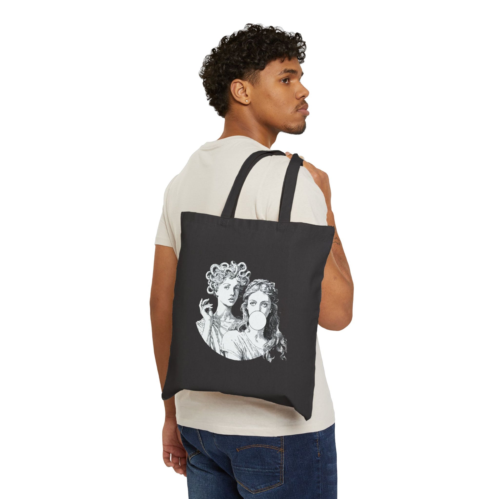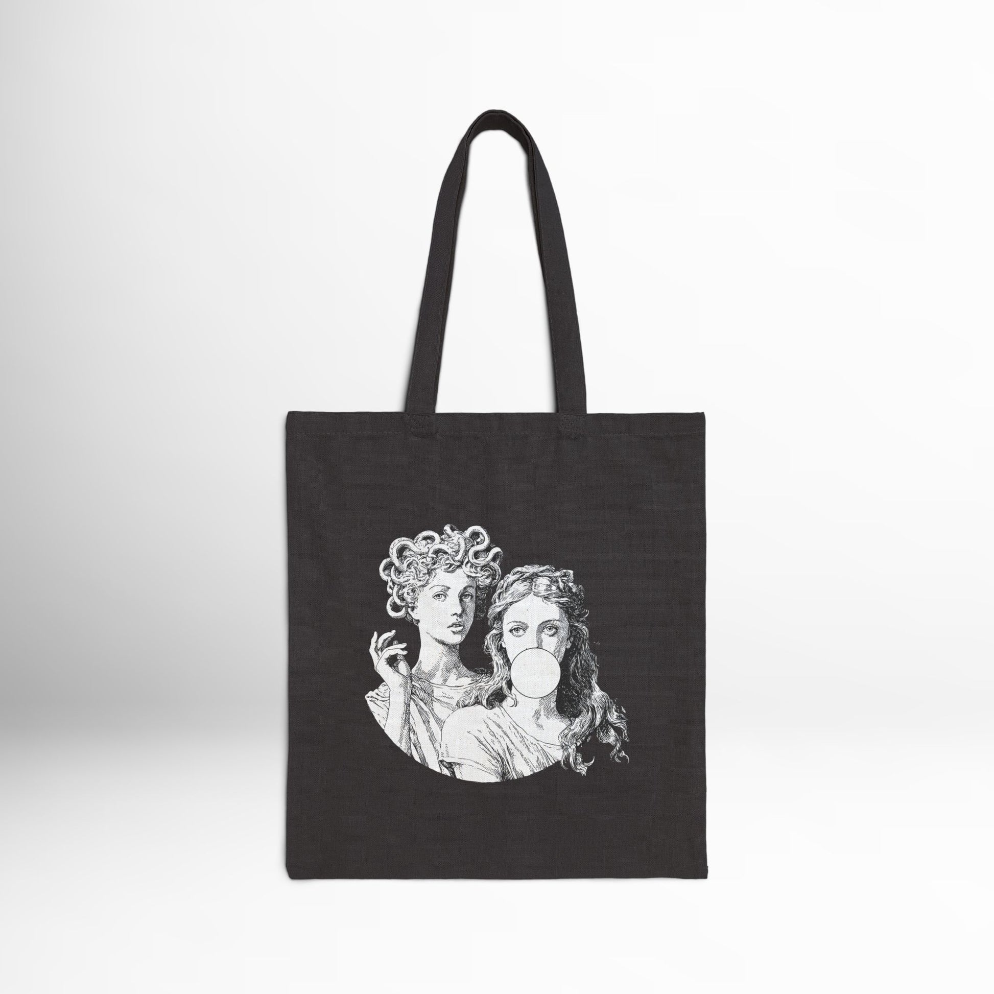 Medusa and Athena Greek mythology tote bag with bubblegum twist. Black cotton reusable tote, eco-friendly and stylish for daily use.
