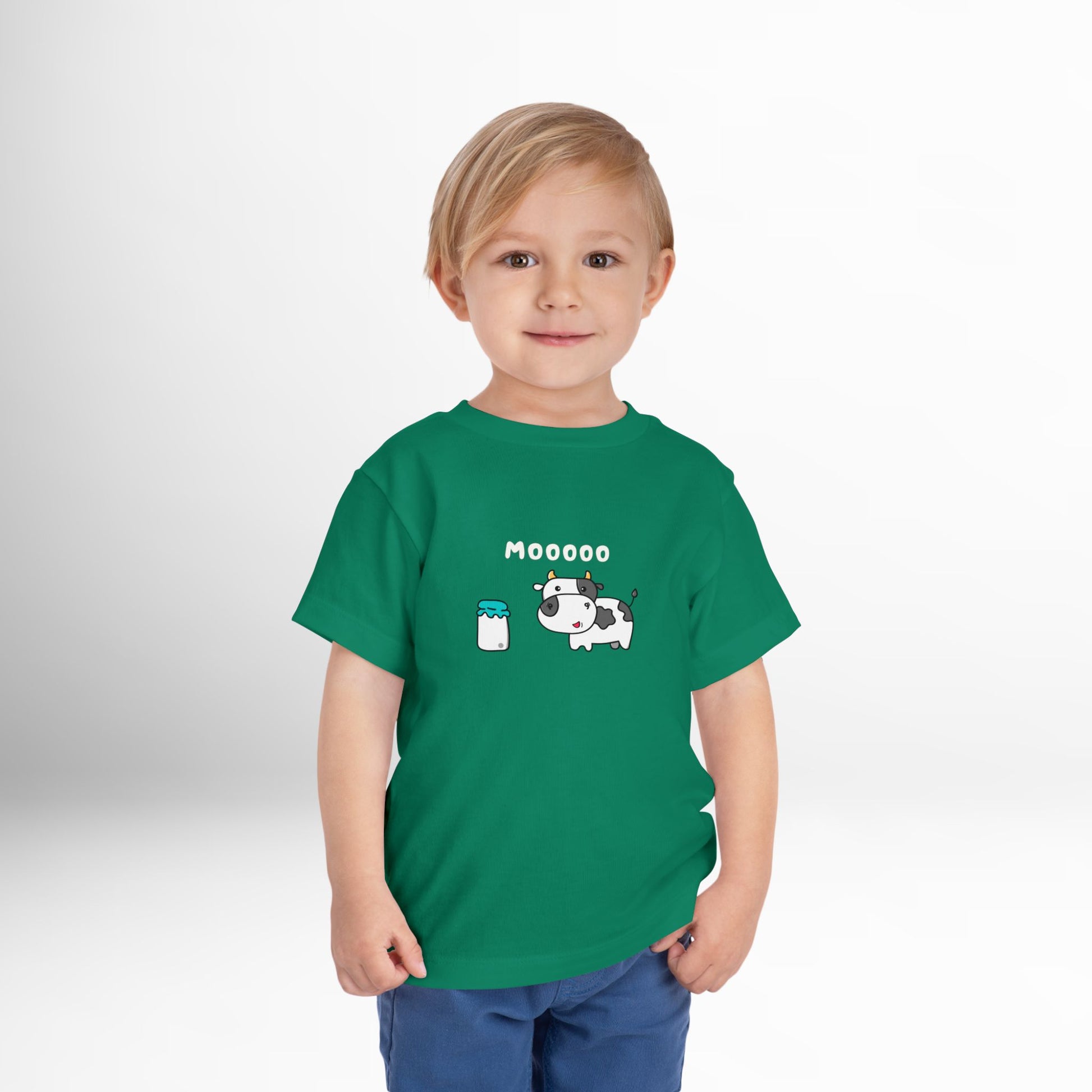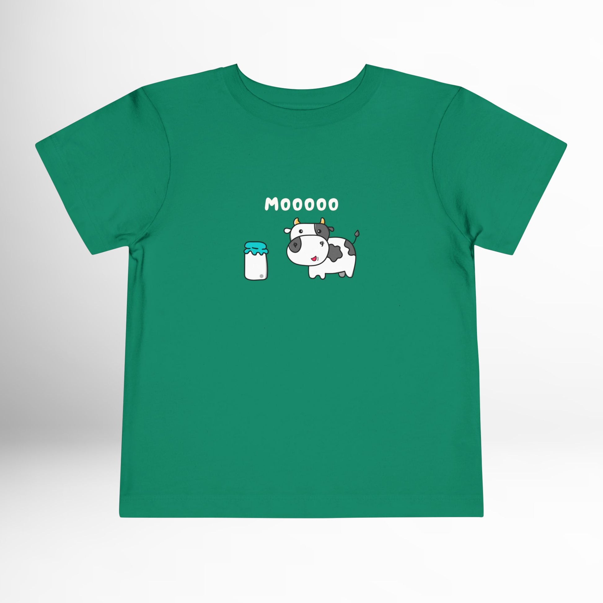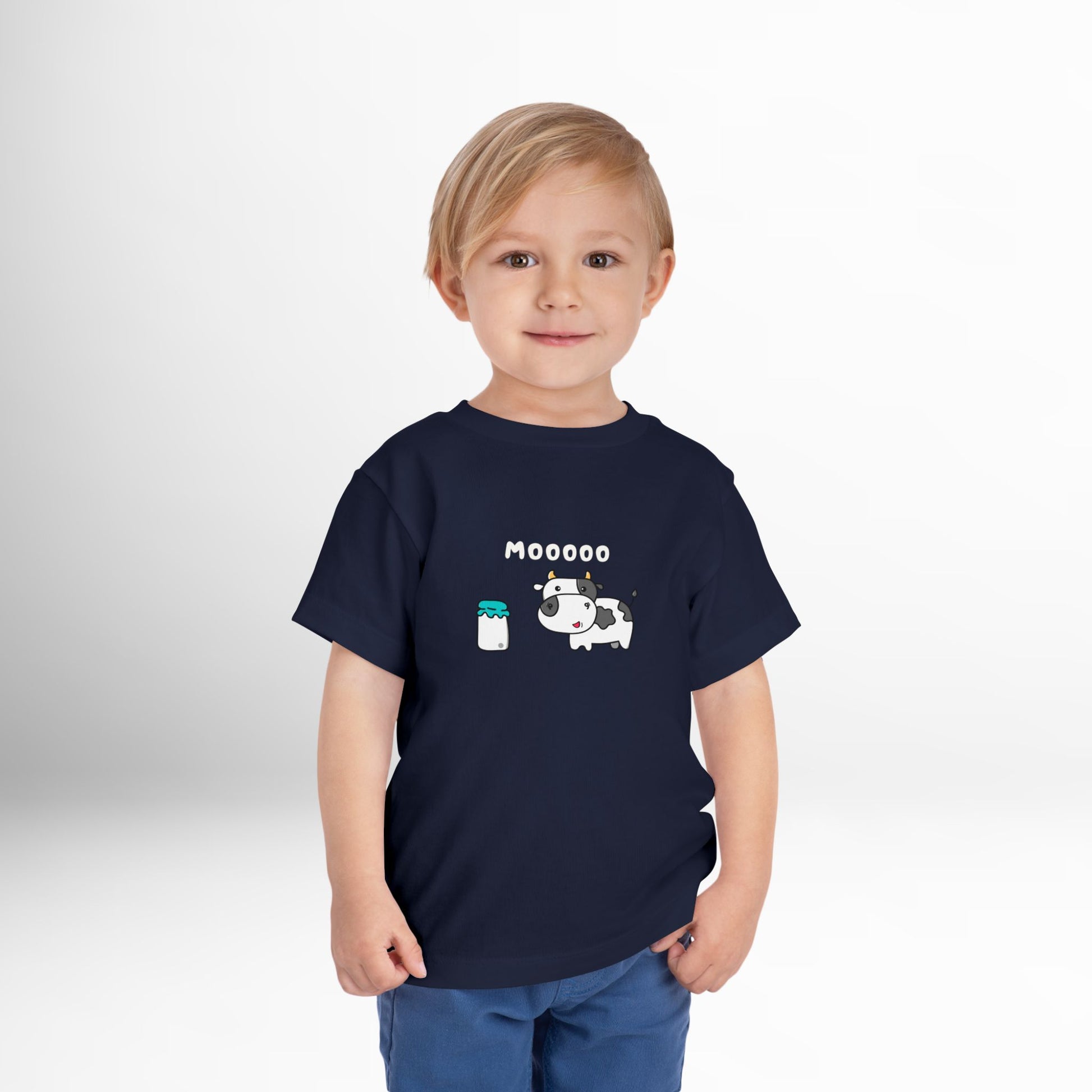 This toddler tee features an adorable cow and milk jug graphic with a bold “Moo.” A fun shirt for farm visits, playtime, or everyday wear.