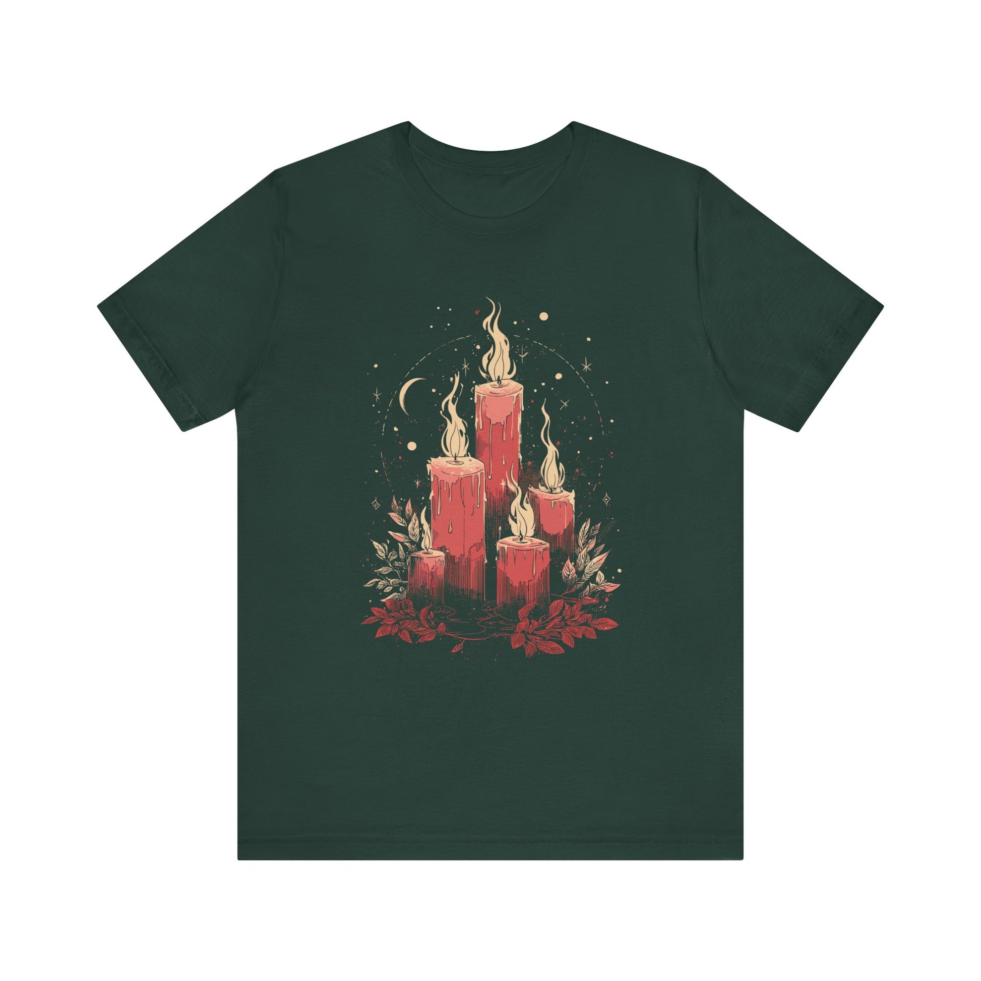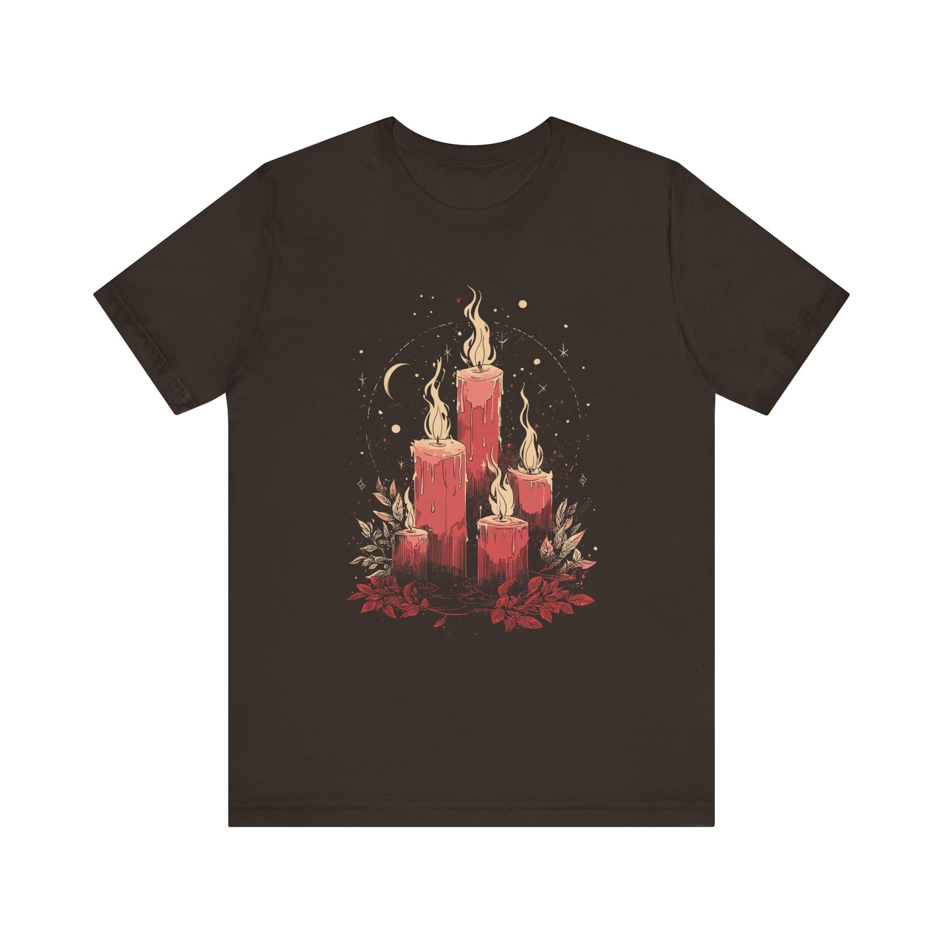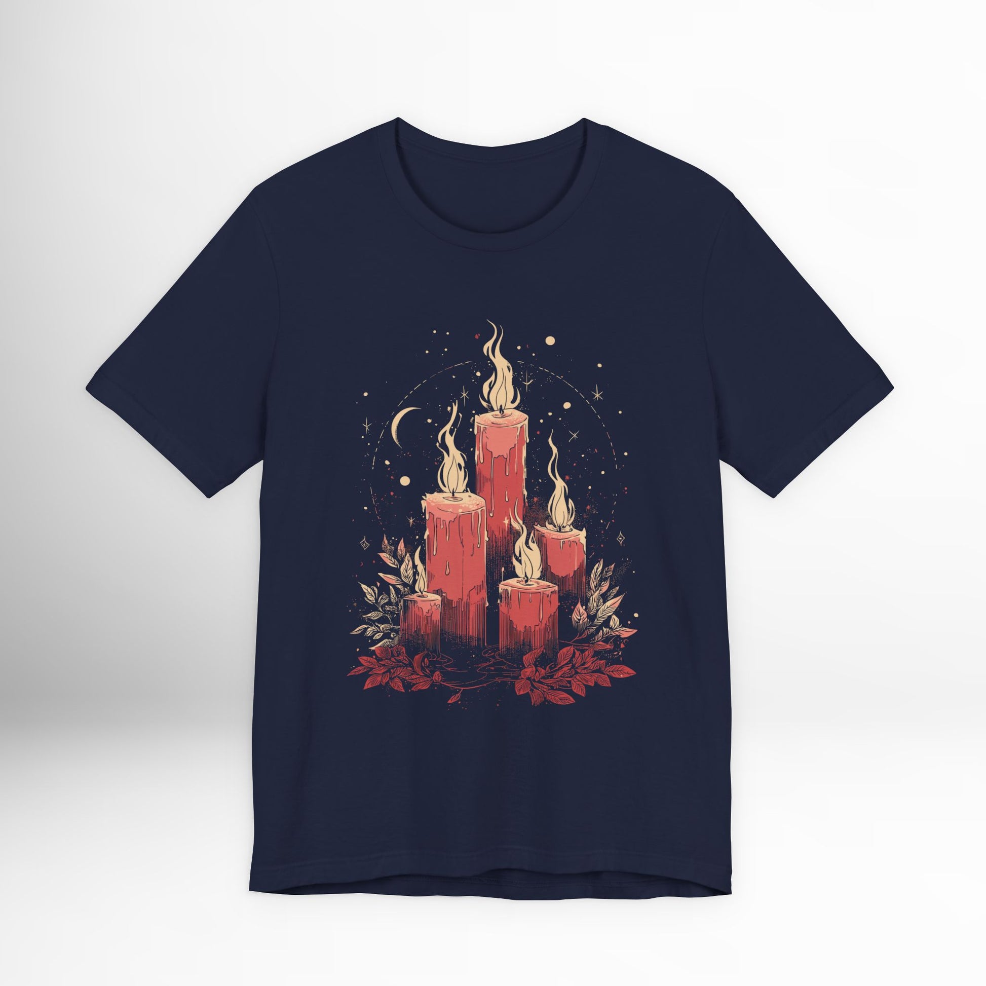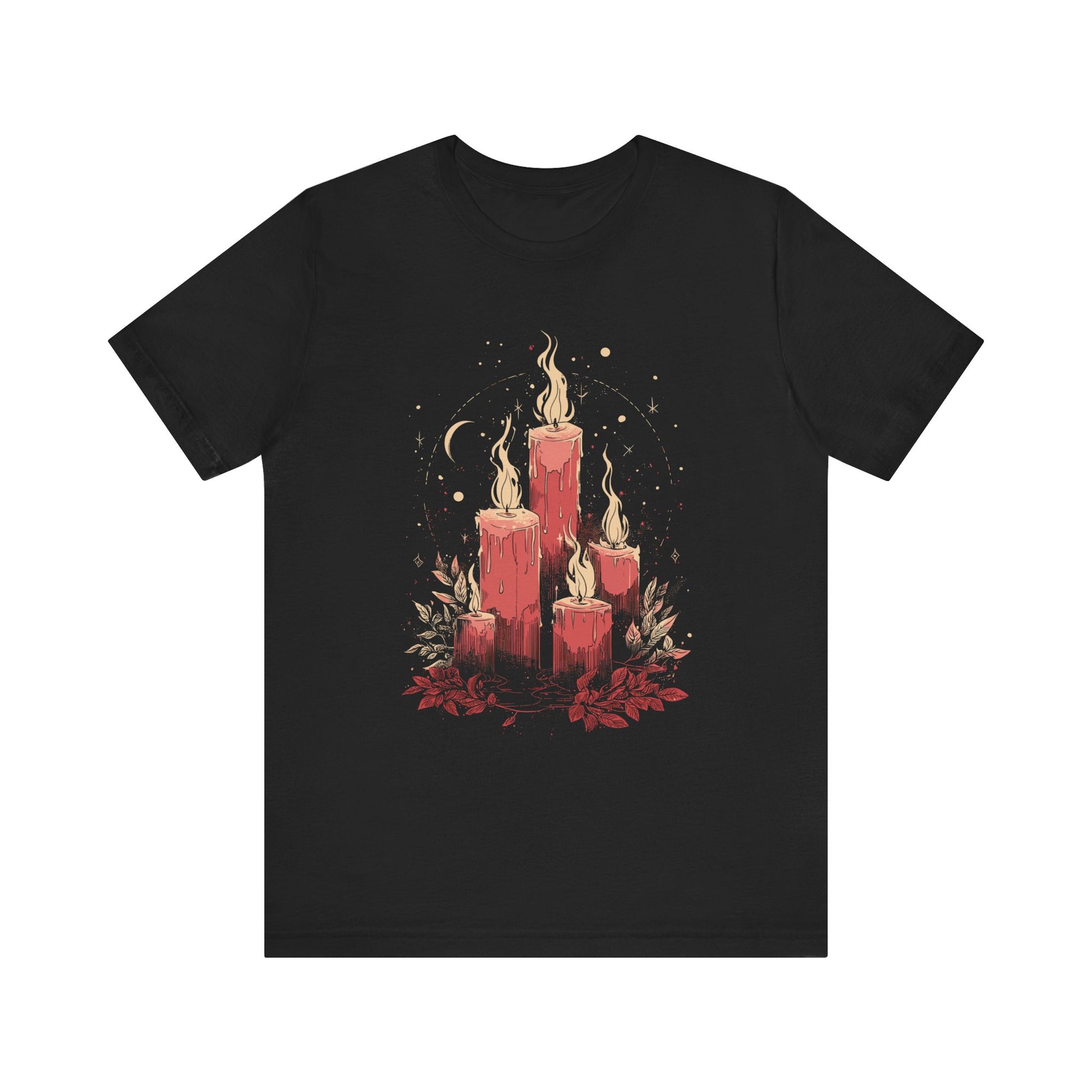 Occult candle t-shirt with gothic mystical design. Witchy moon phase graphic tee, perfect for pagan, astrology & alternative dark aesthetic fashion lovers.