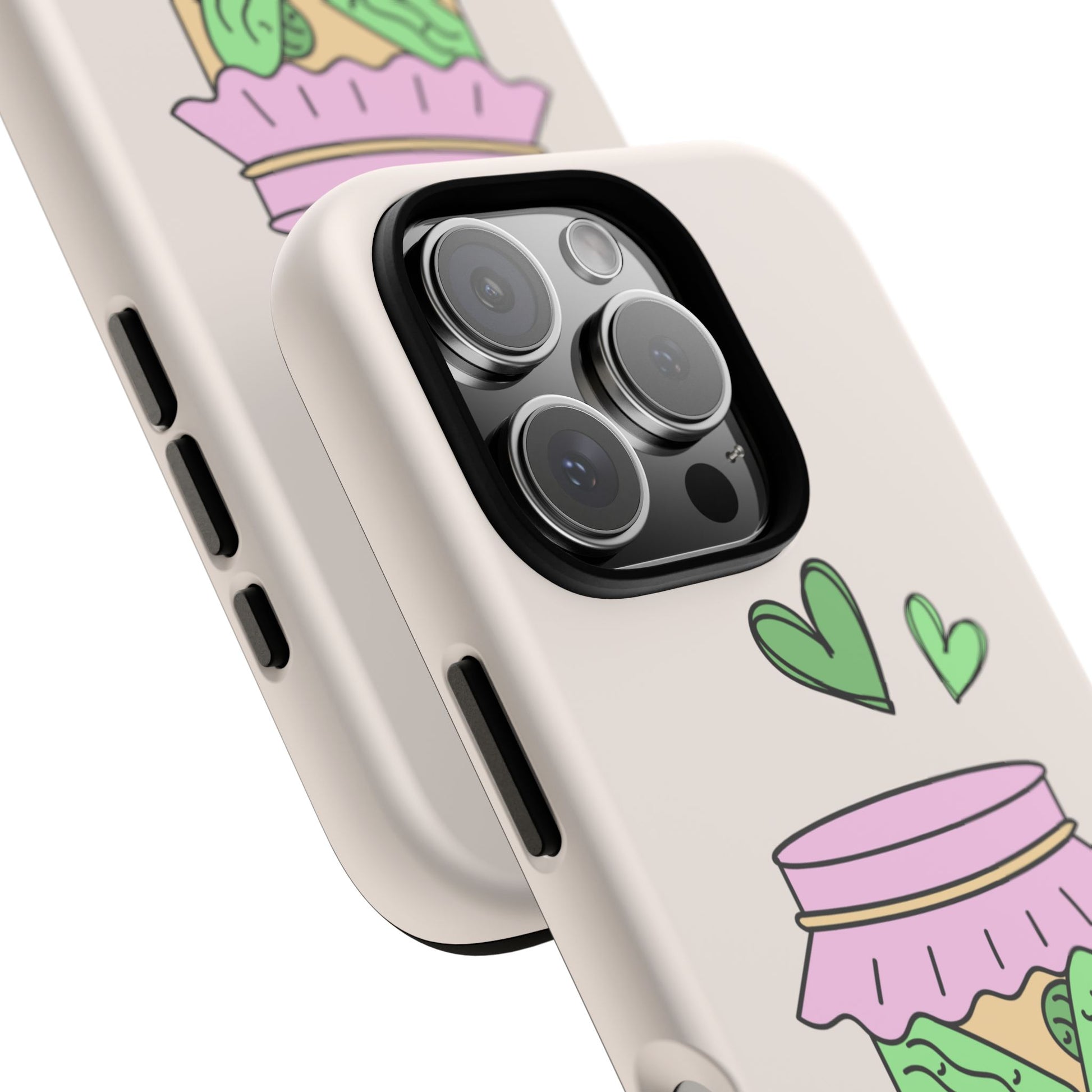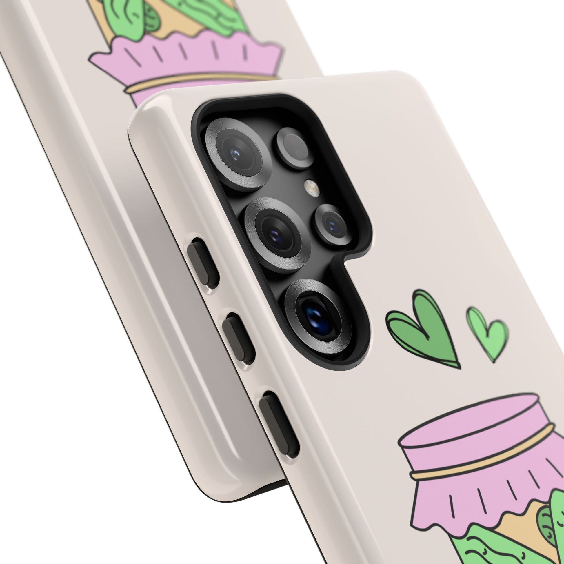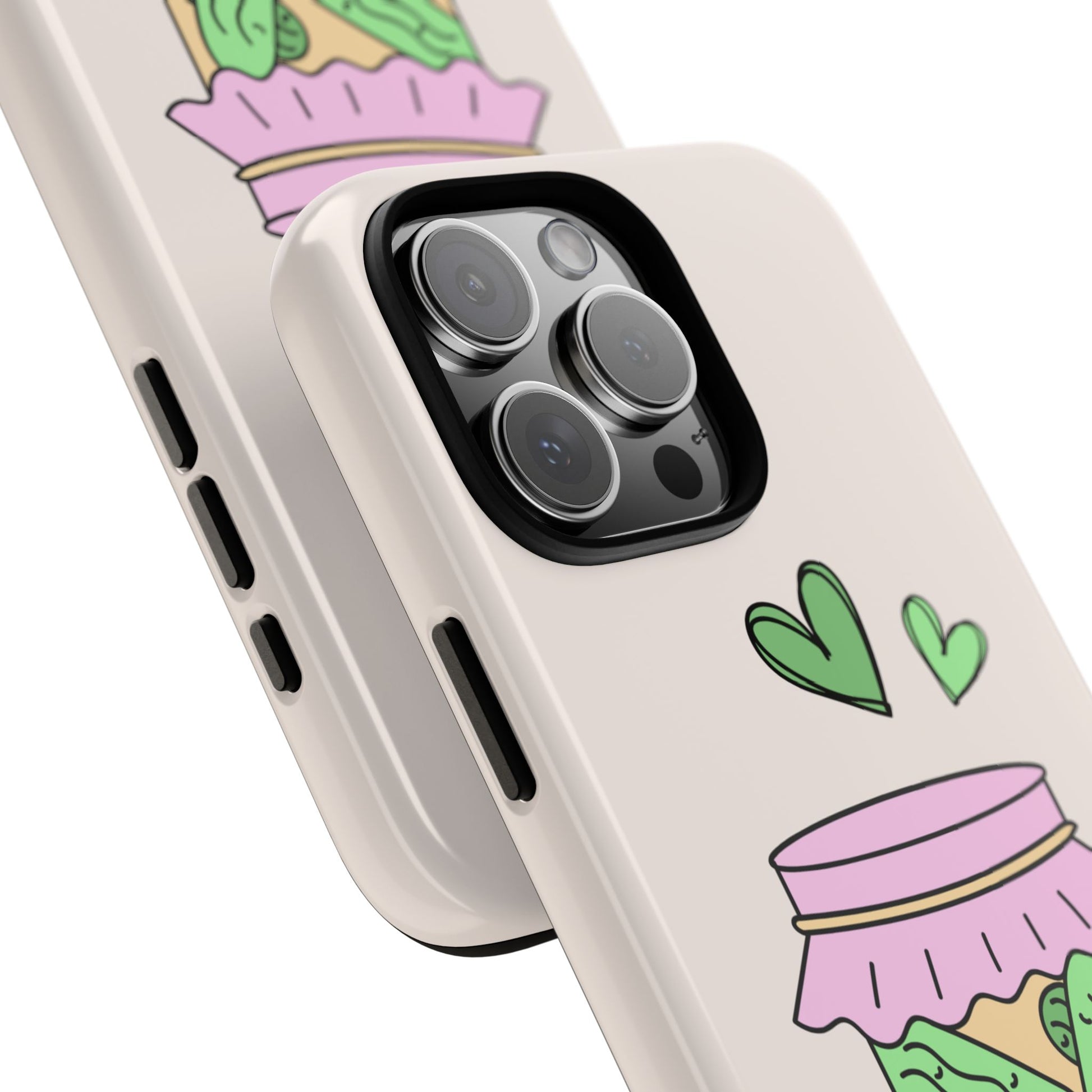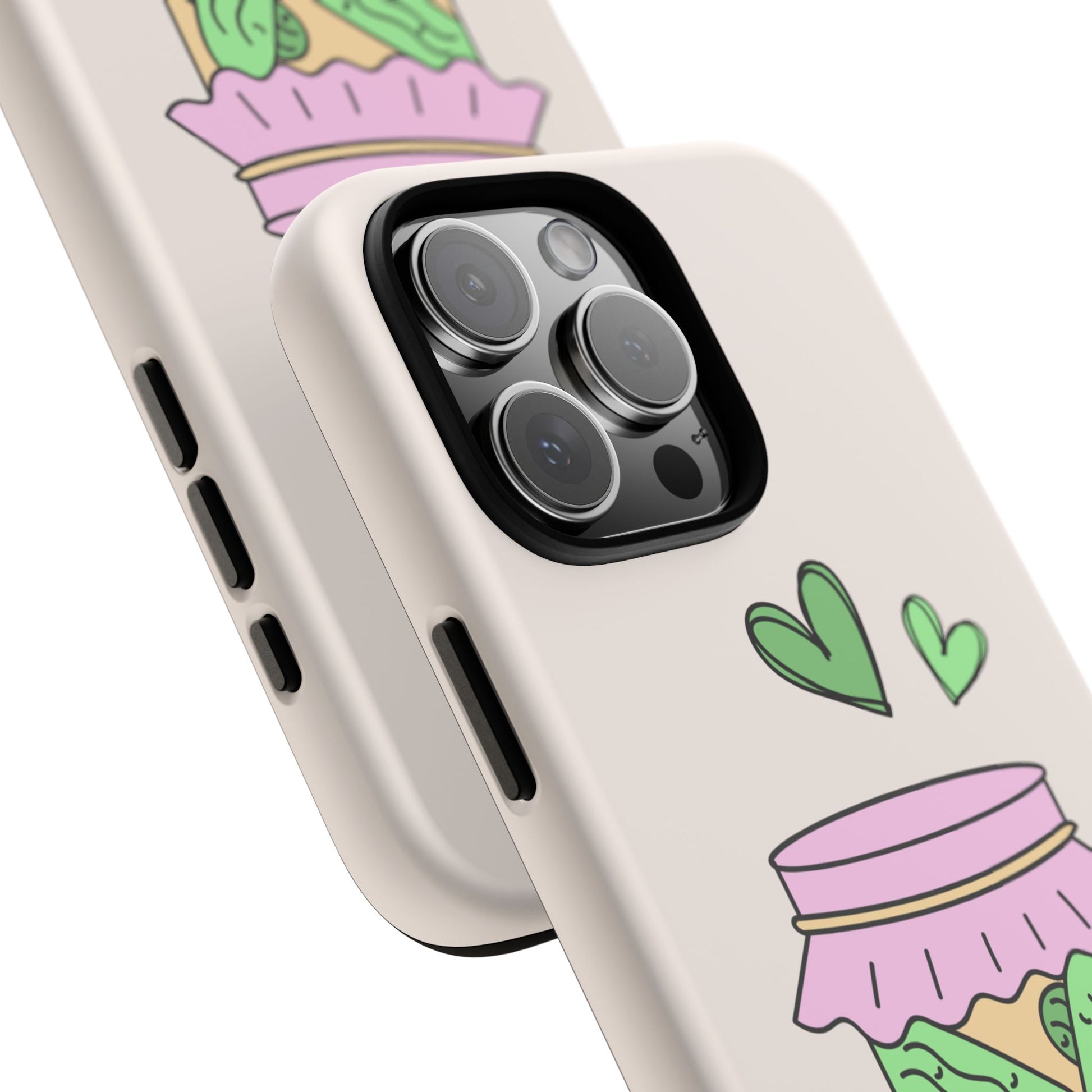 Funny pickle jar phone case for iPhone, Samsung & Pixel. Cute kawaii food design, perfect quirky gift for pickle lovers & unique phone accessory fans.