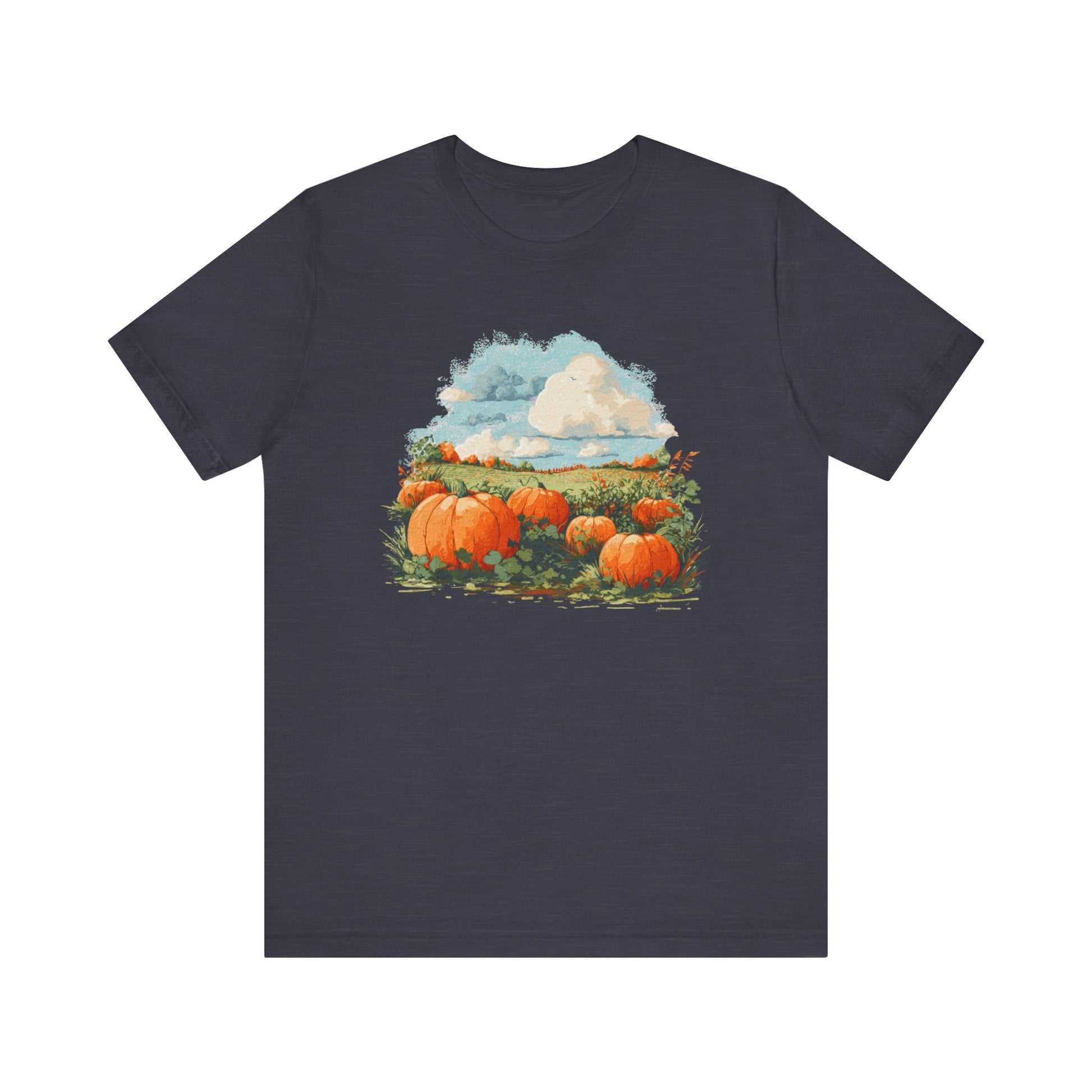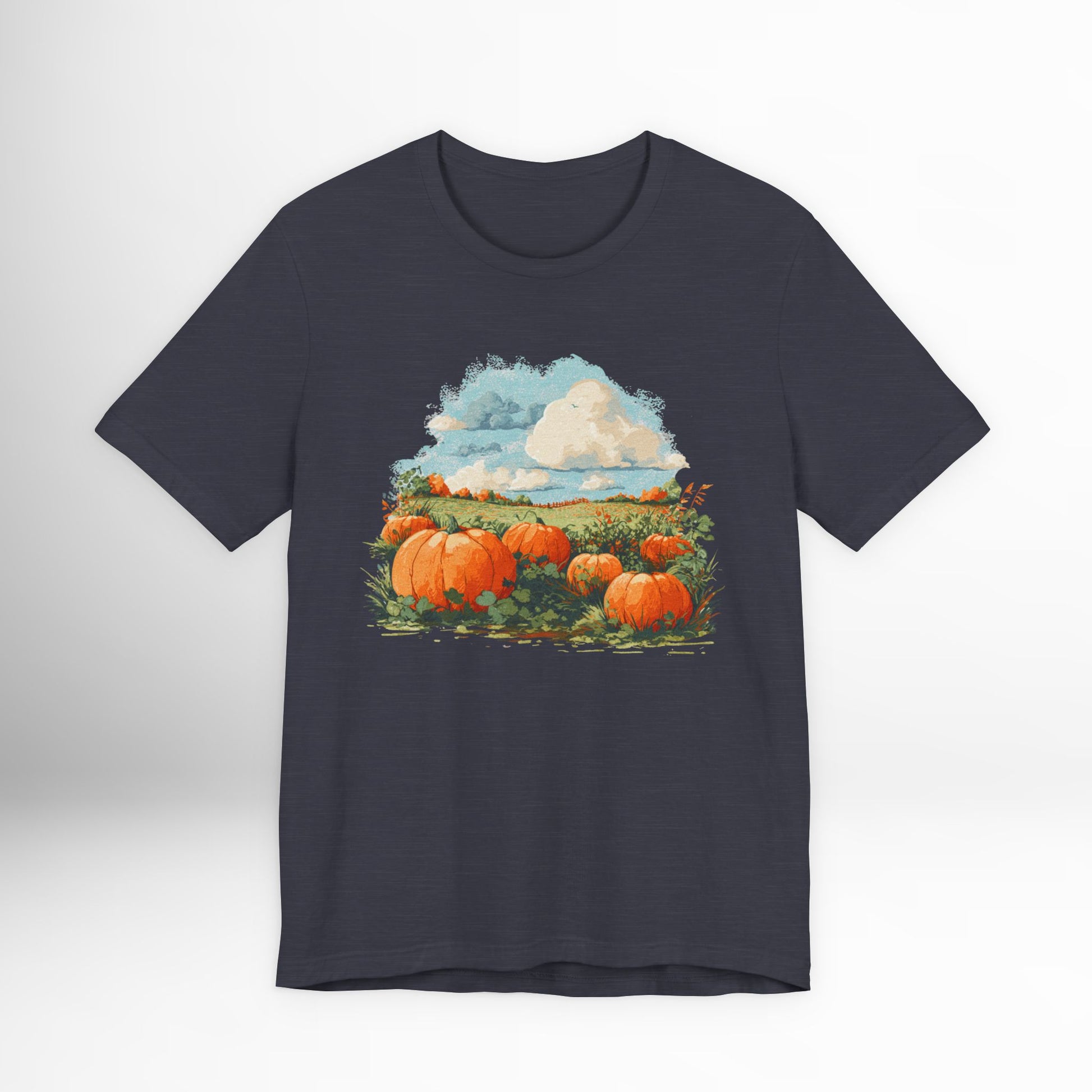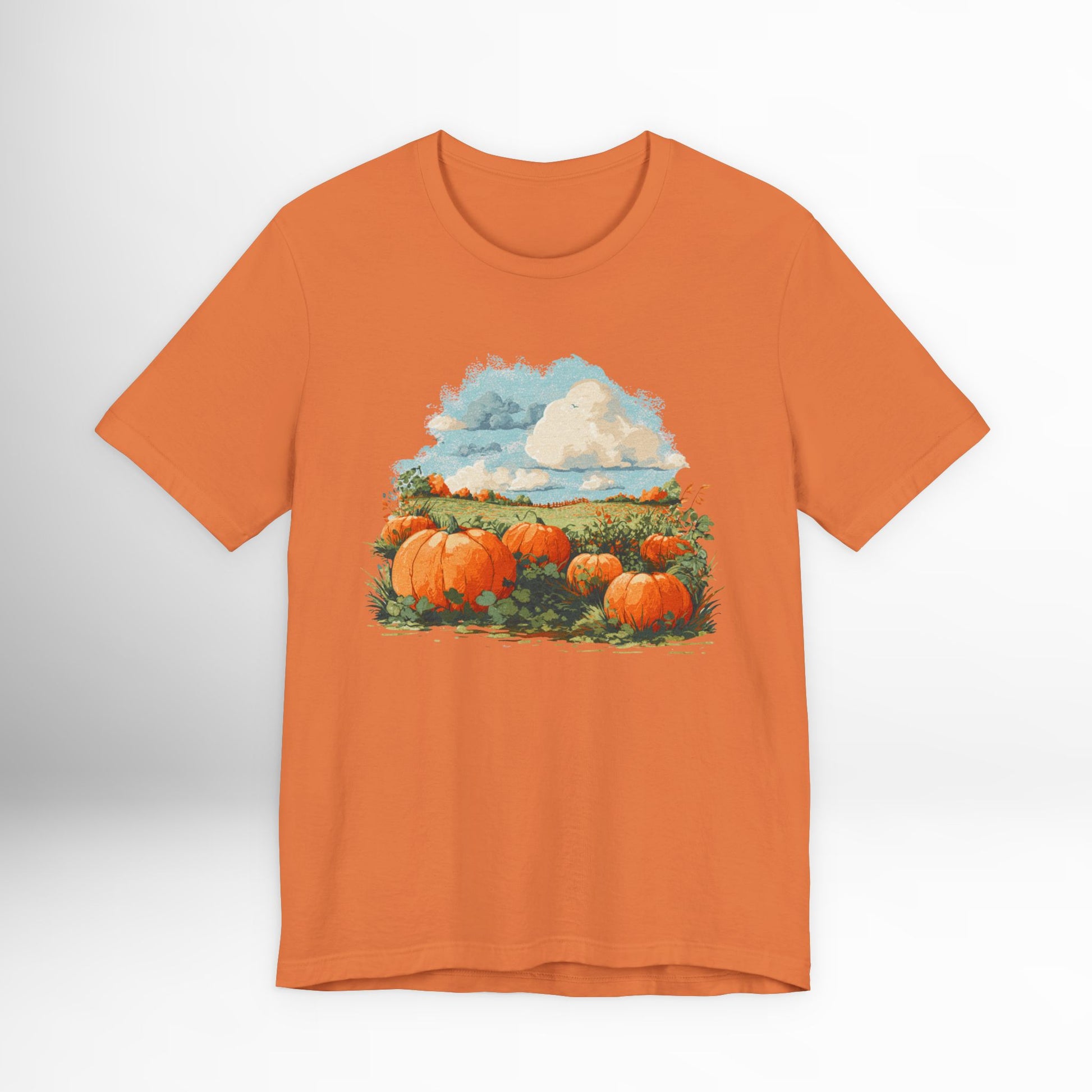 Pumpkin patch scenic t-shirt with autumn harvest design. Cozy fall graphic tee for pumpkin lovers, farm visits & country seasonal fashion.