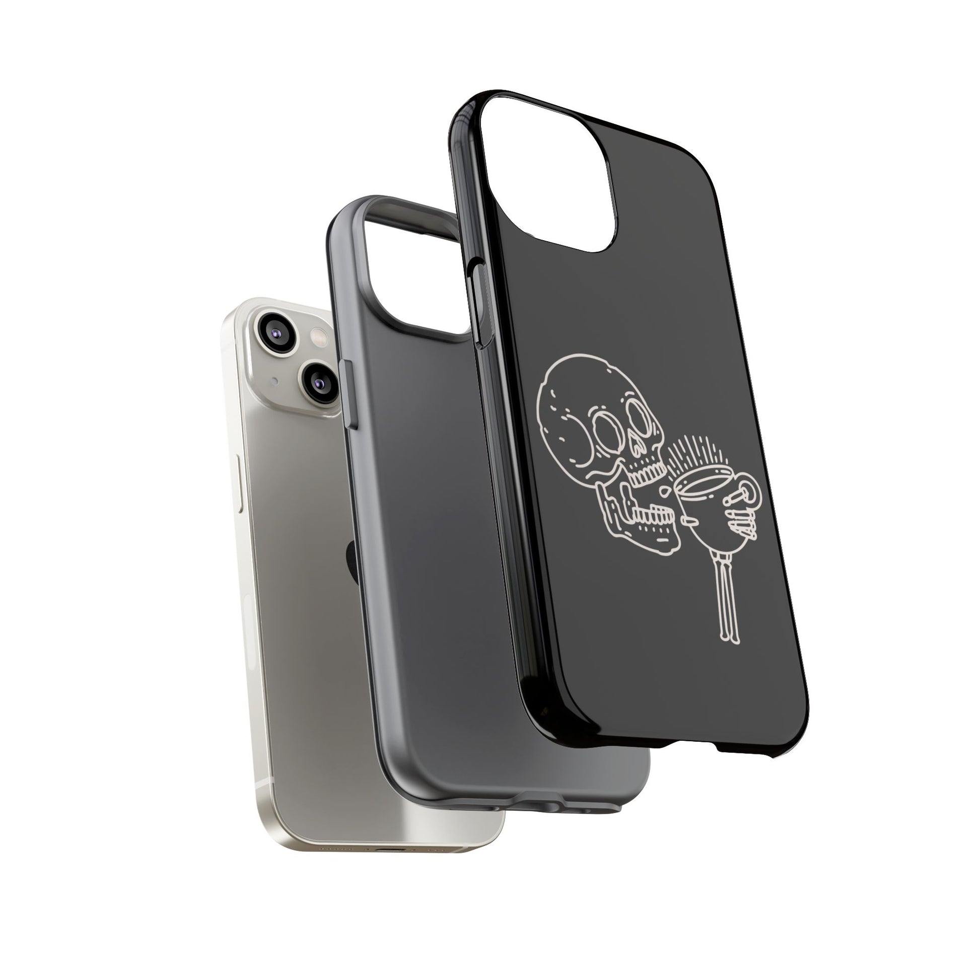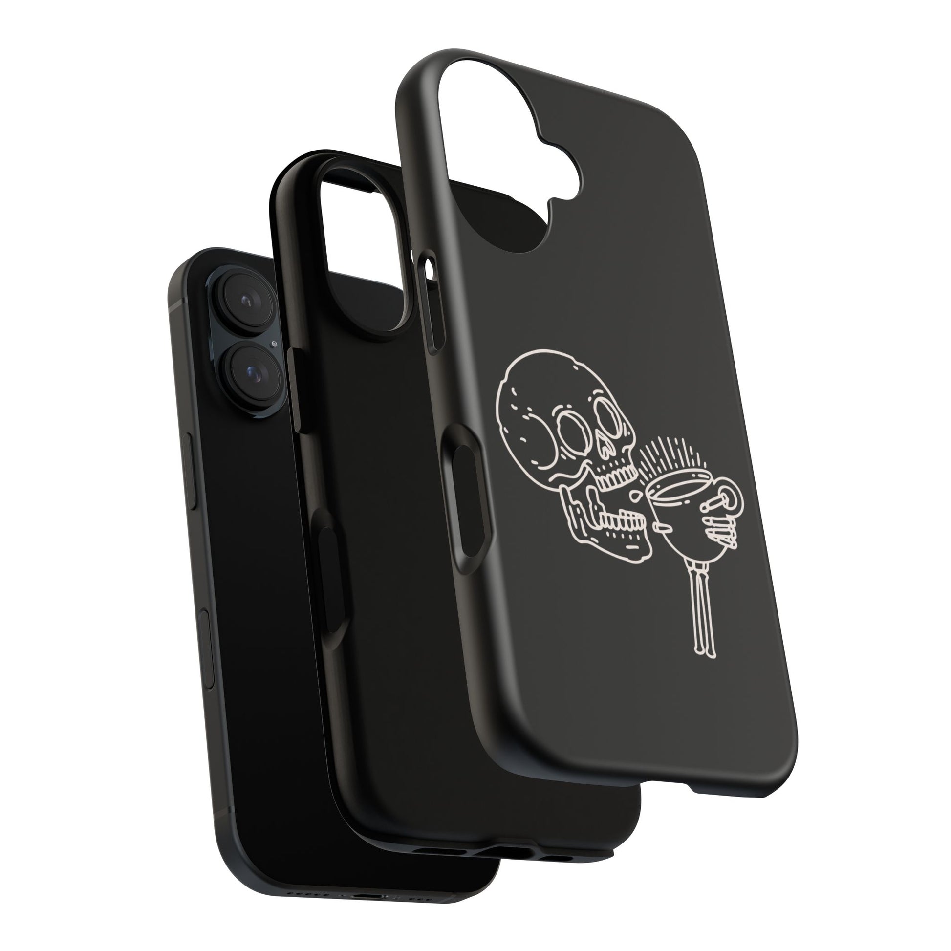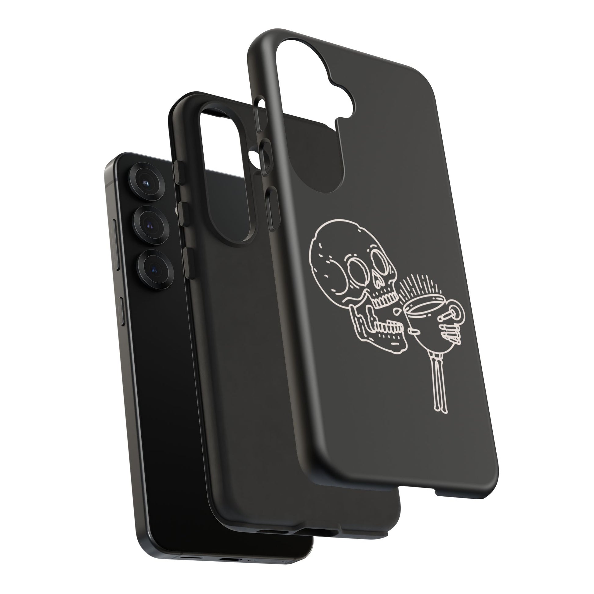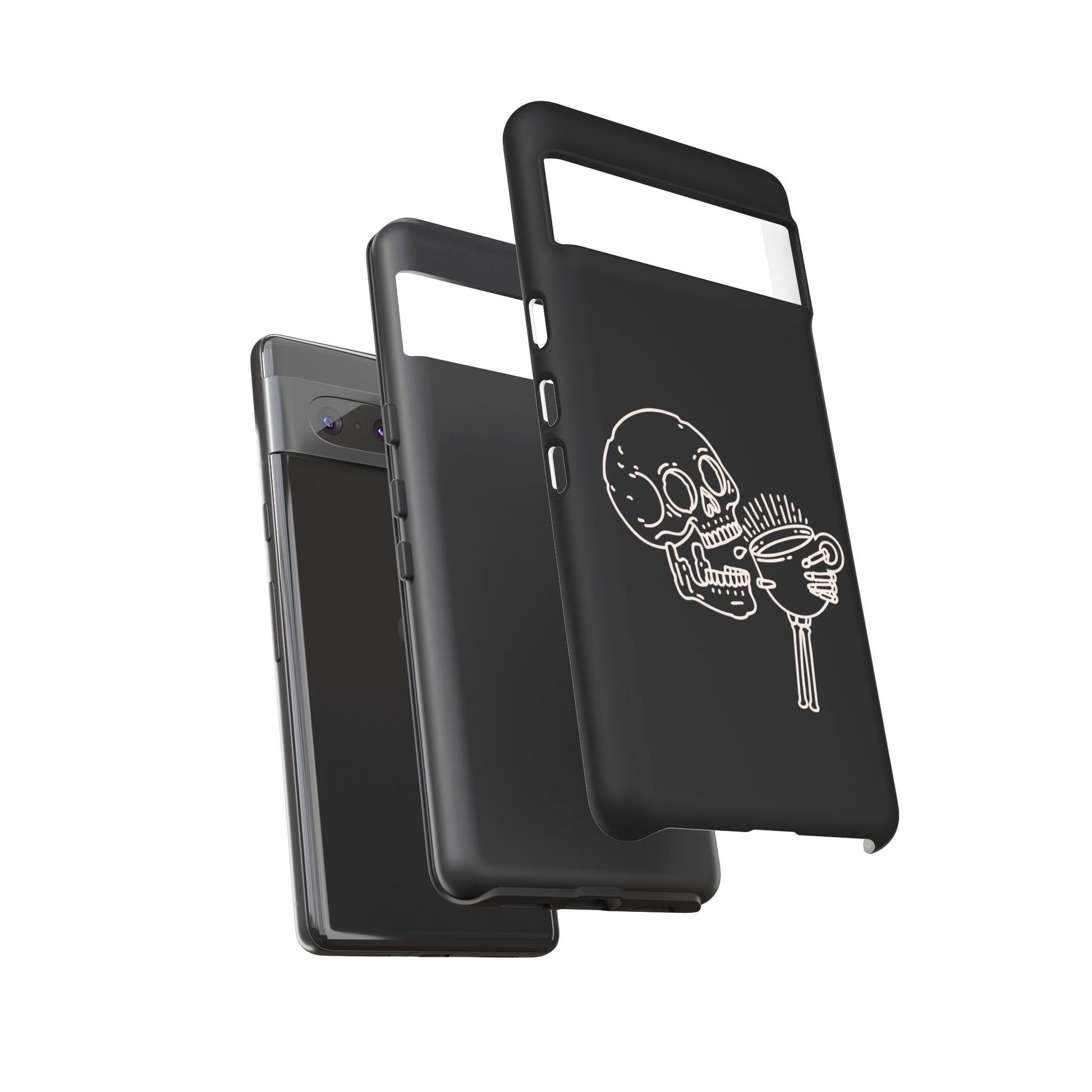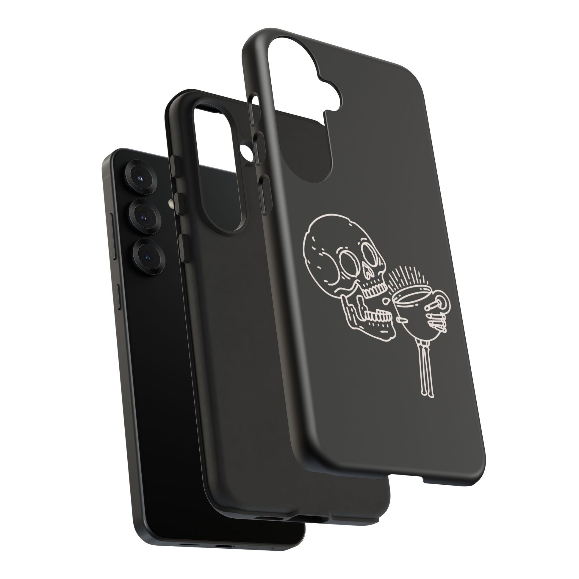Skull and coffee phone case for iPhone, Samsung & Pixel. Gothic dark aesthetic design, perfect alternative accessory for coffee lovers & spooky style fans.