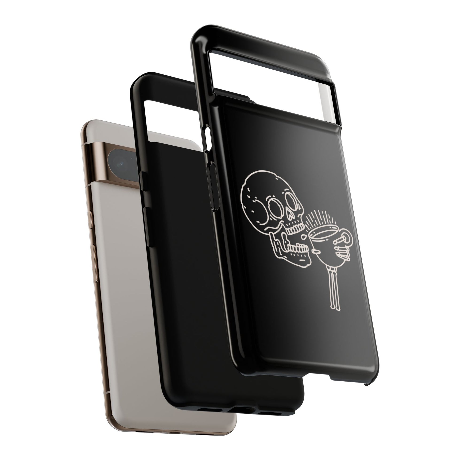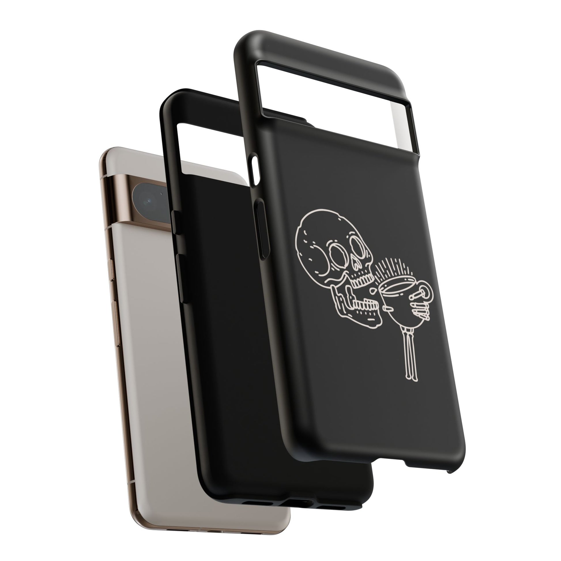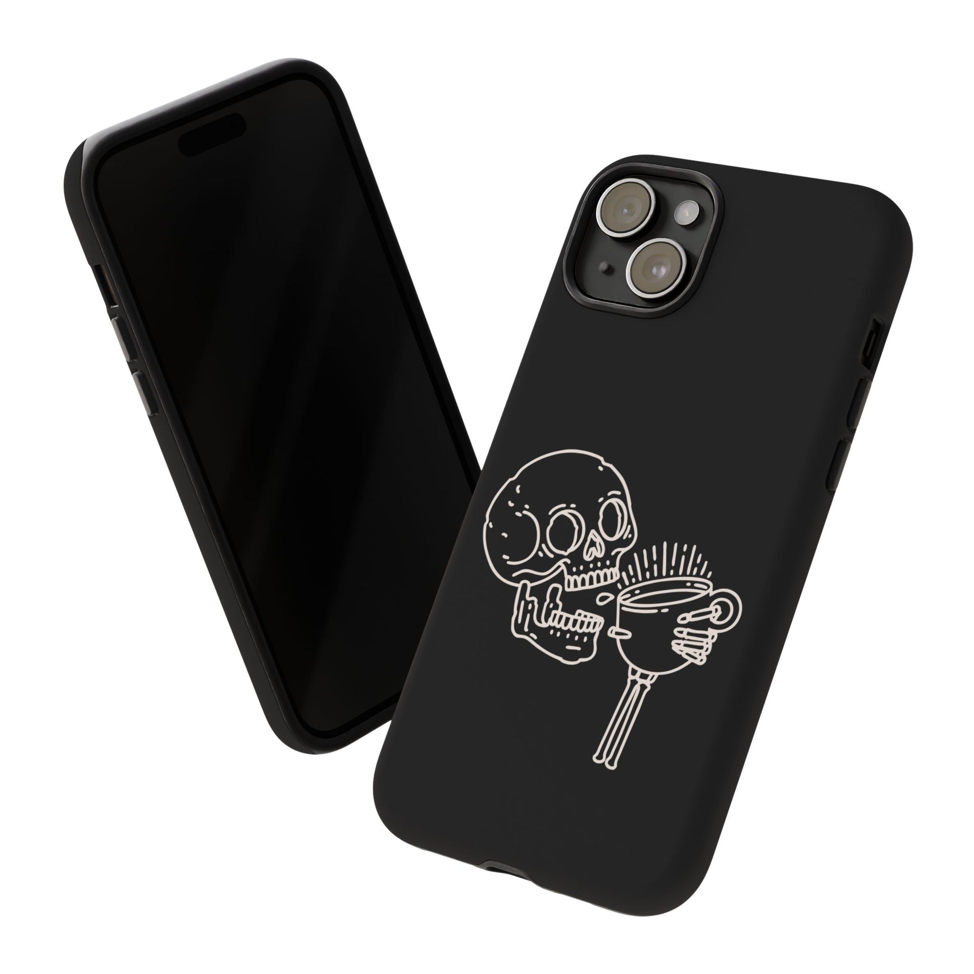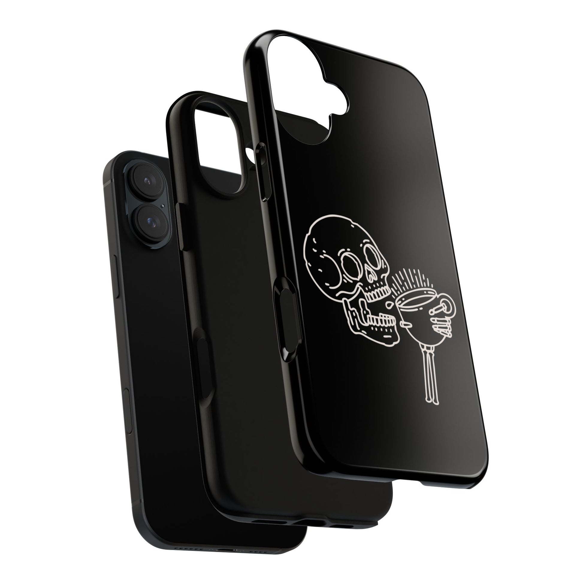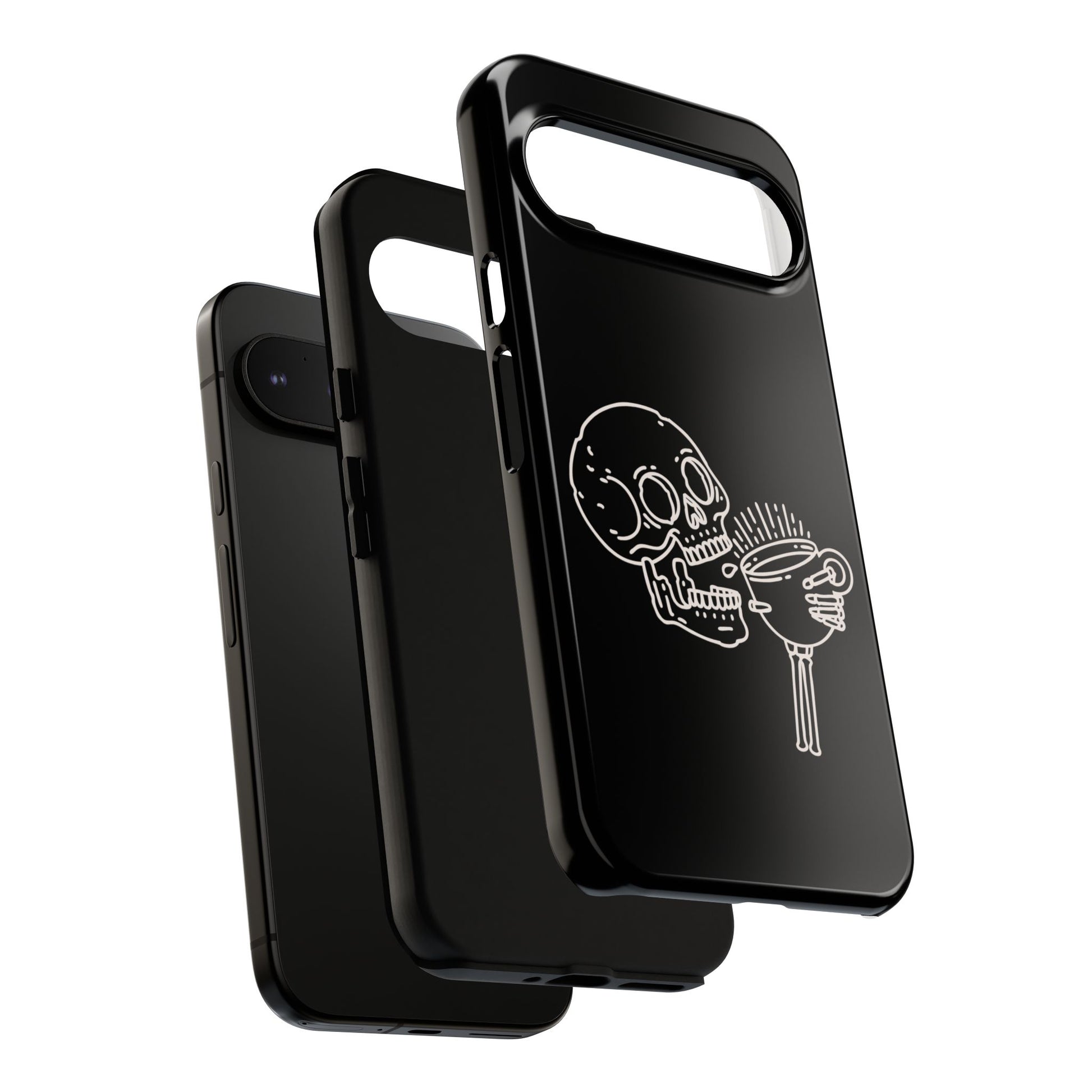 Skull and coffee phone case for iPhone, Samsung & Pixel. Gothic dark aesthetic design, perfect alternative accessory for coffee lovers & spooky style fans.