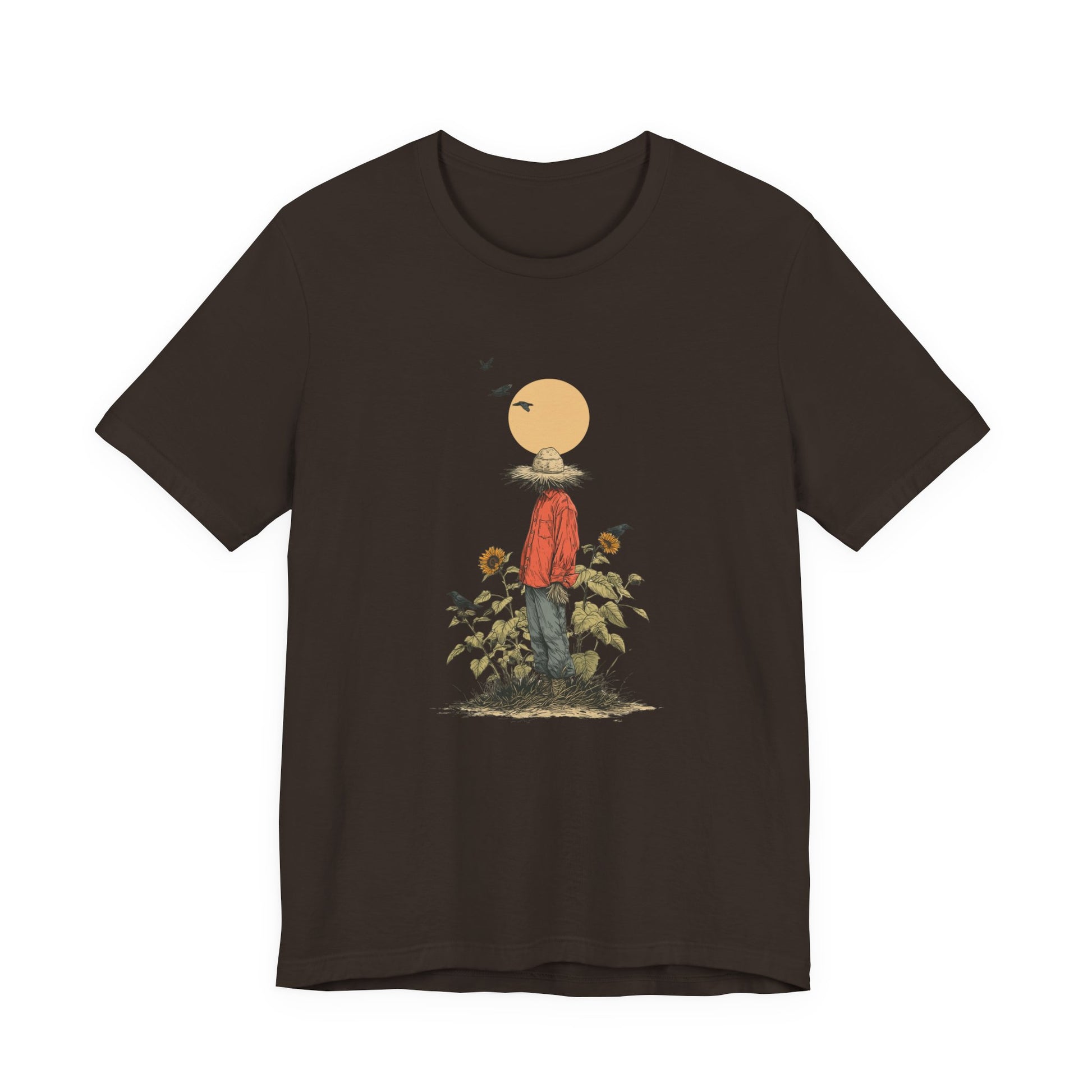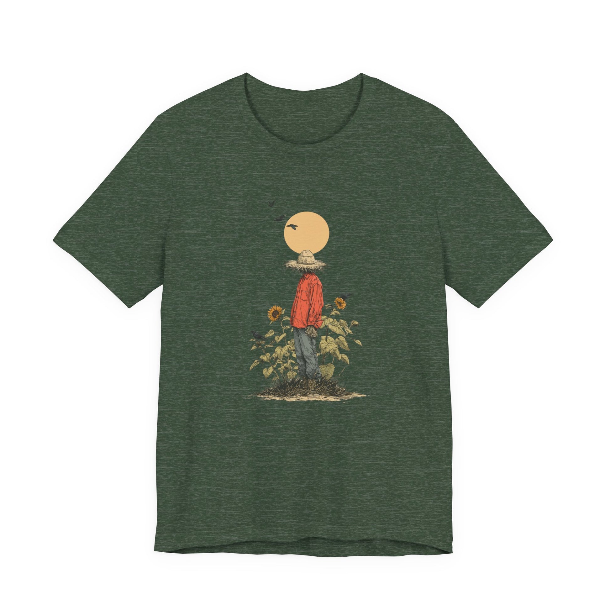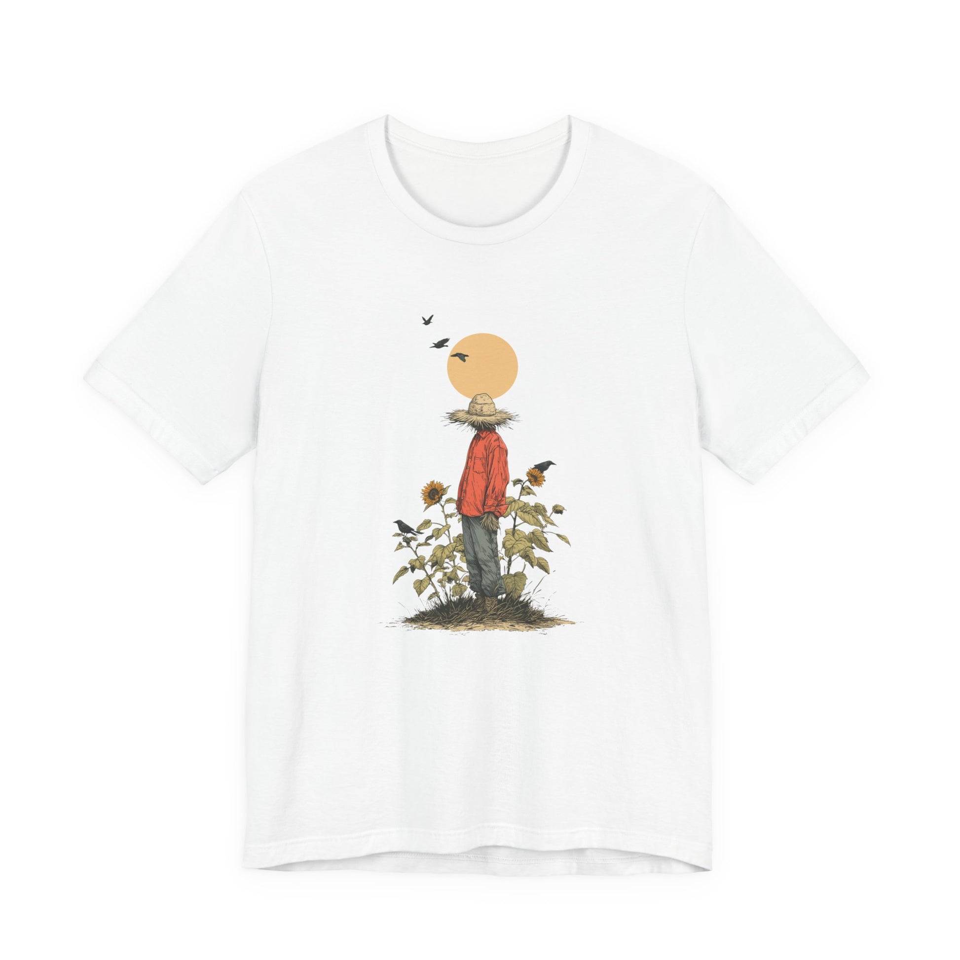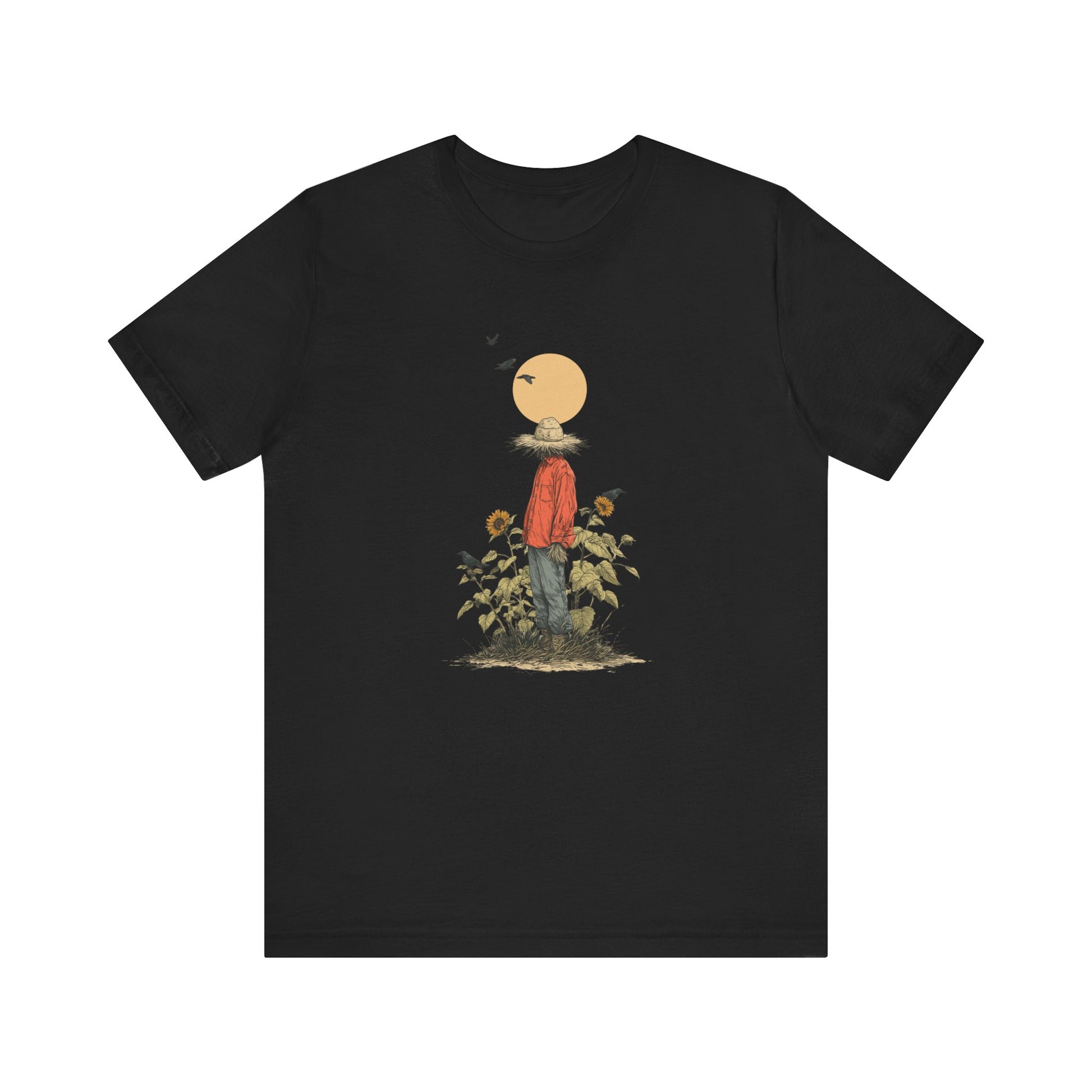 A little spooky, a little sweet. This Halloween-ready scarecrow tee features sunflowers and crows in a slightly eerie farm scene—perfect for October vibes. Whether you're heading to the corn maze or just leaning into haunted harvest aesthetics, this shirt does the trick.
