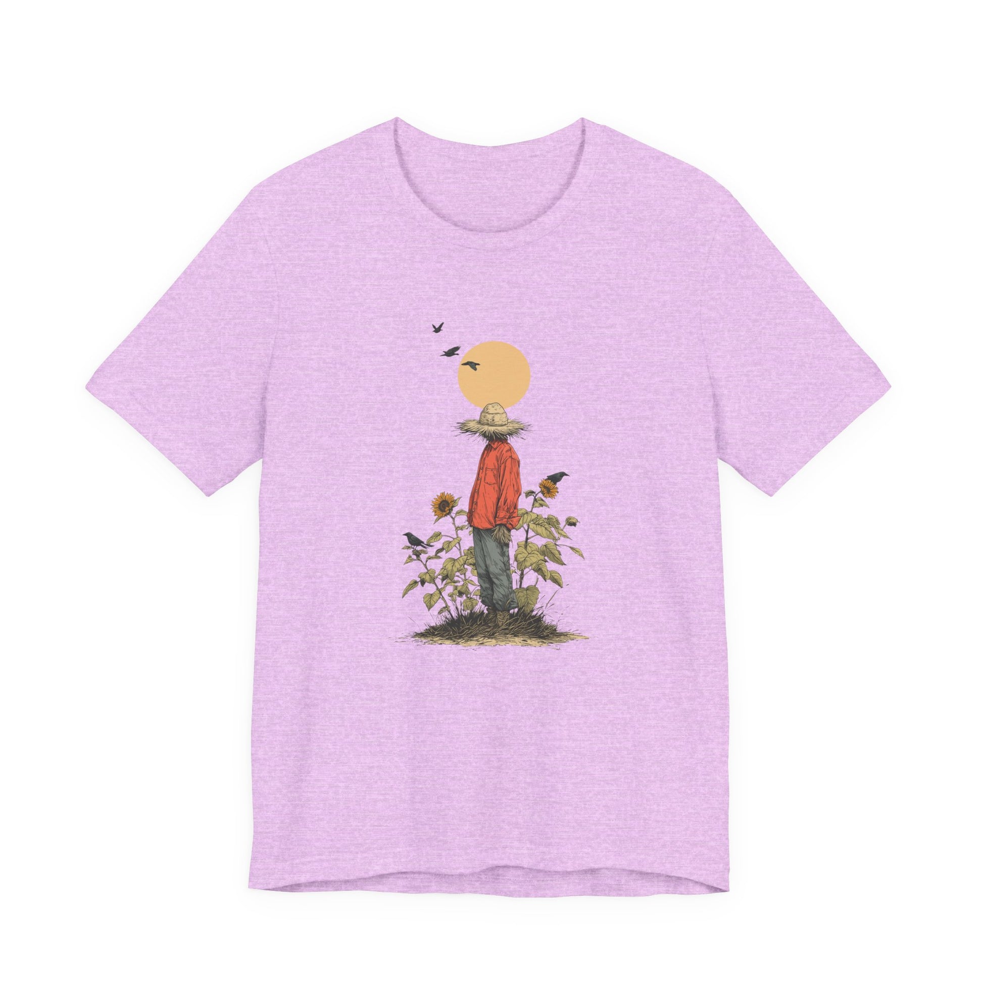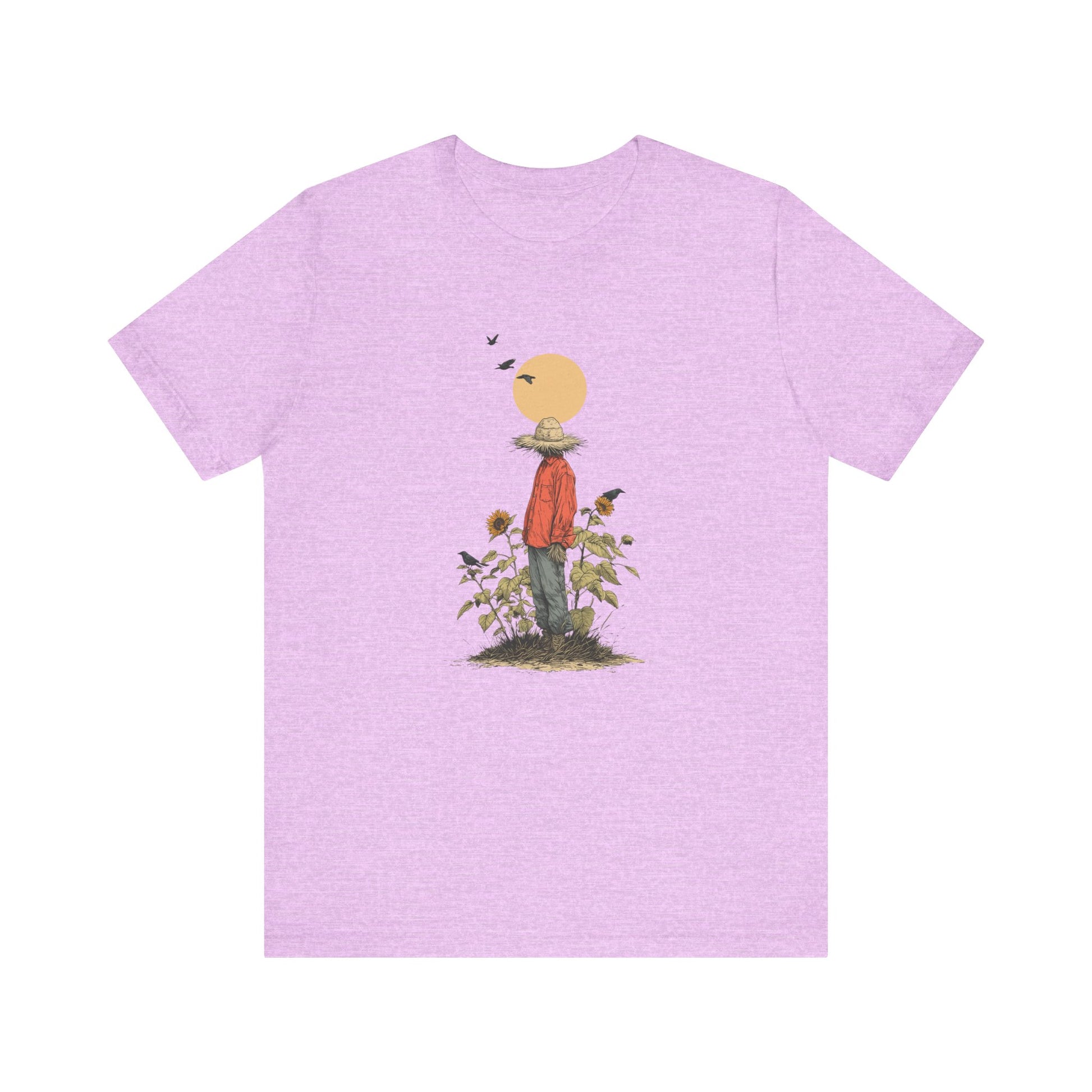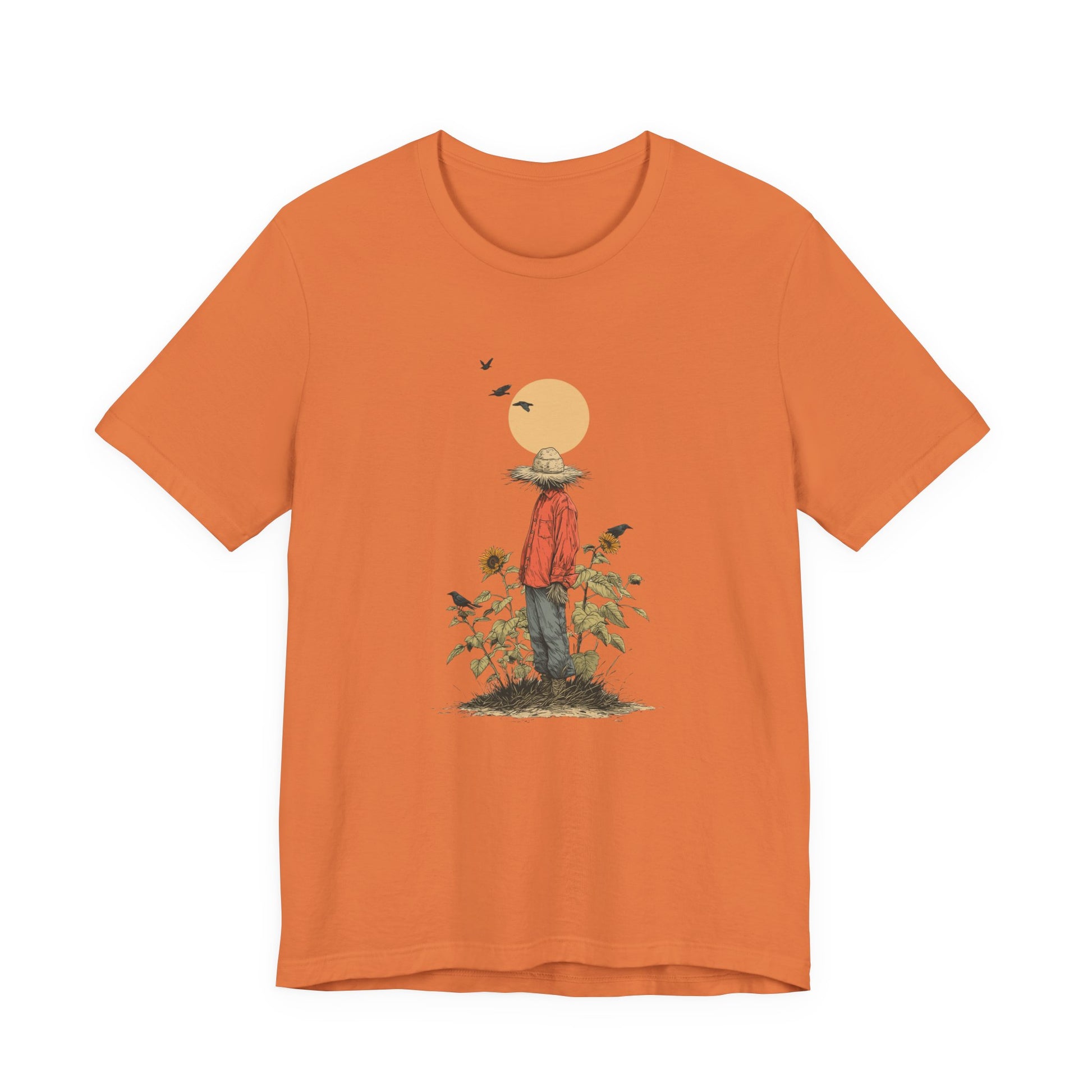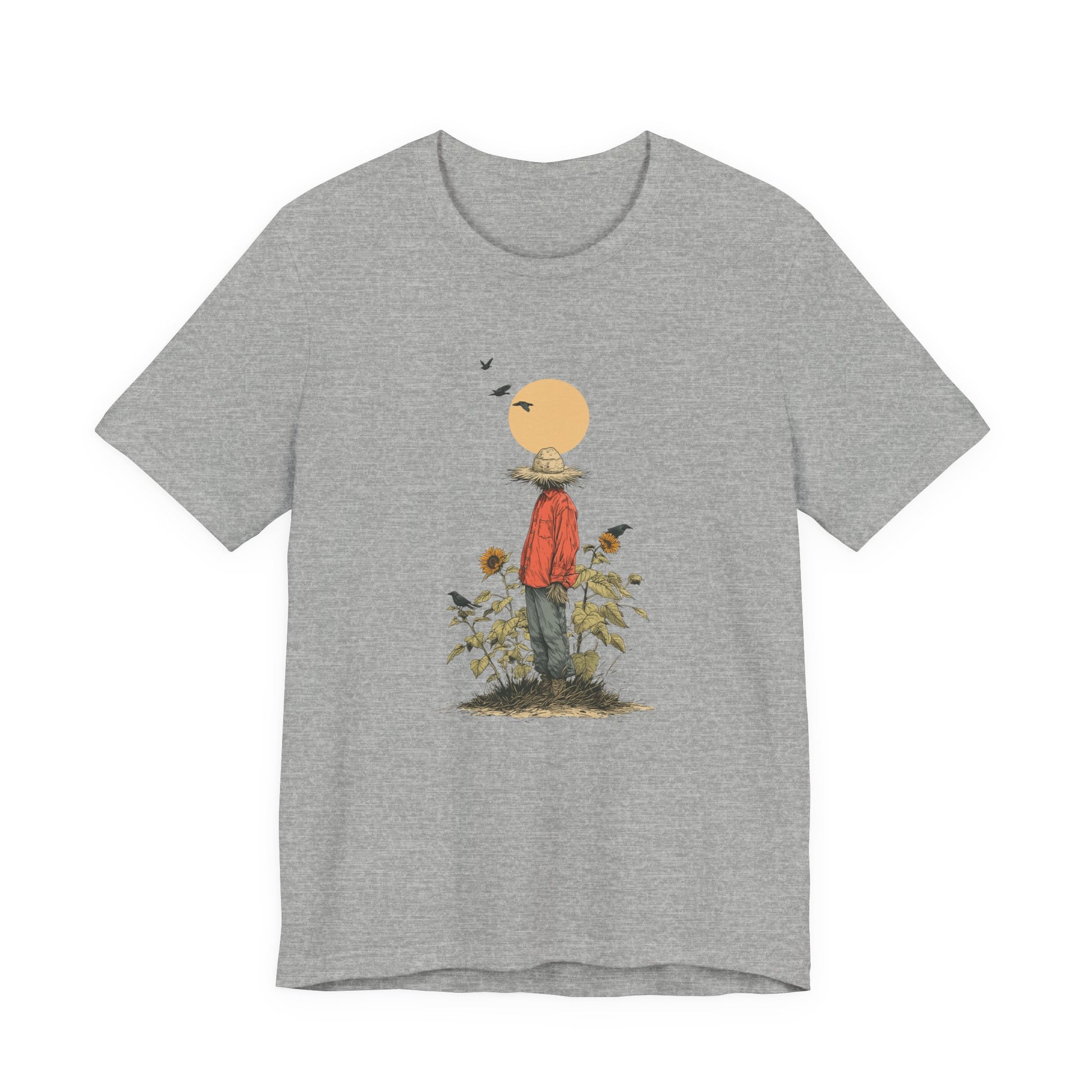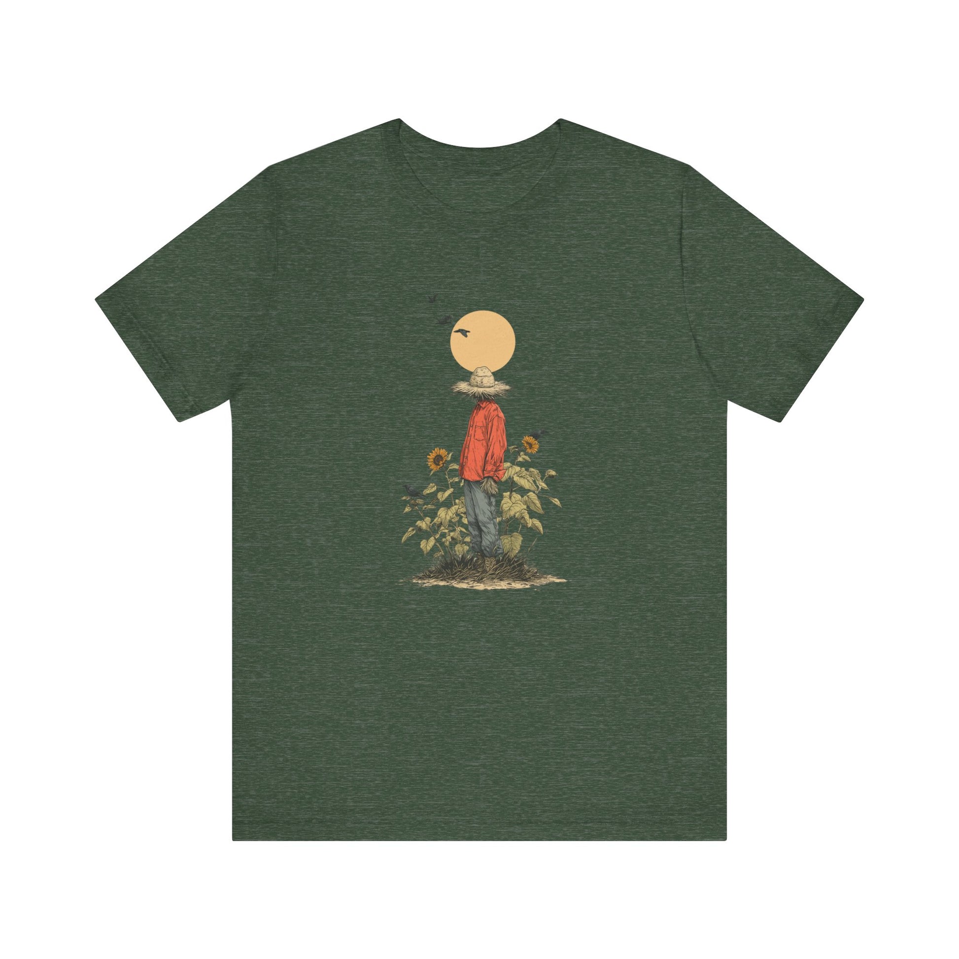 A little spooky, a little sweet. This Halloween-ready scarecrow tee features sunflowers and crows in a slightly eerie farm scene—perfect for October vibes. Whether you're heading to the corn maze or just leaning into haunted harvest aesthetics, this shirt does the trick.
