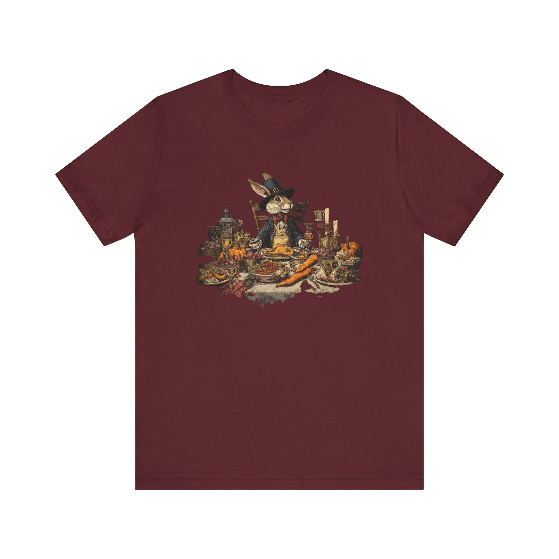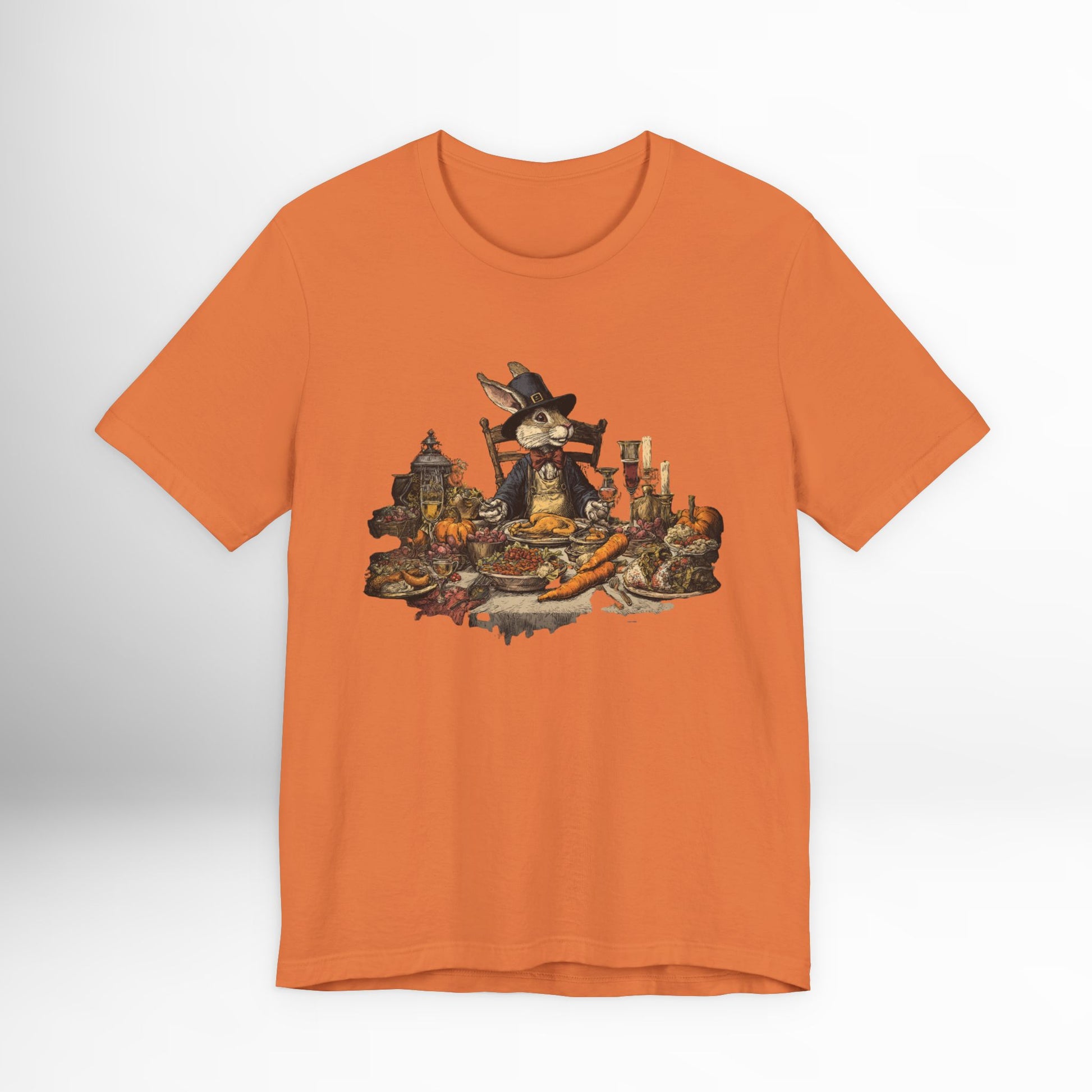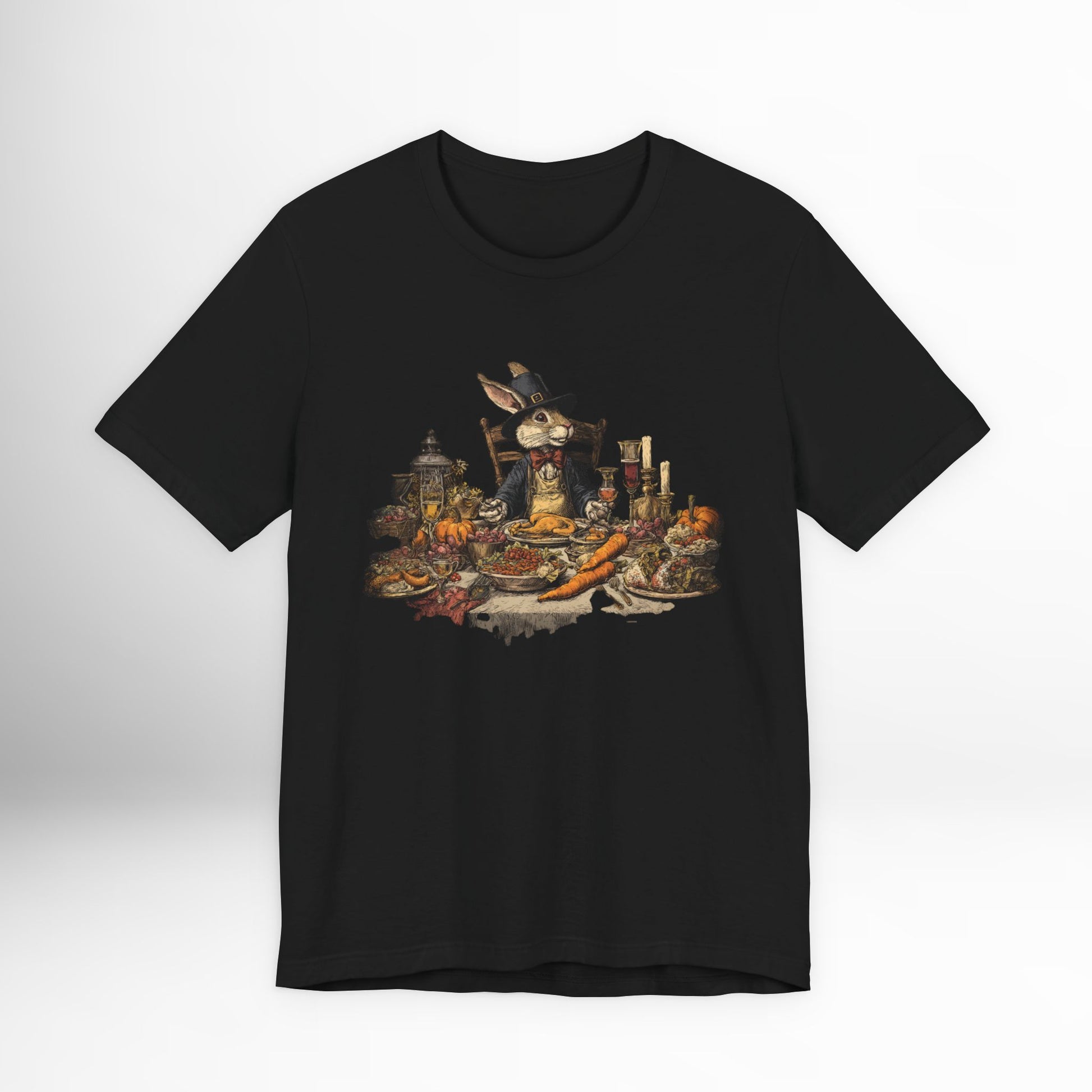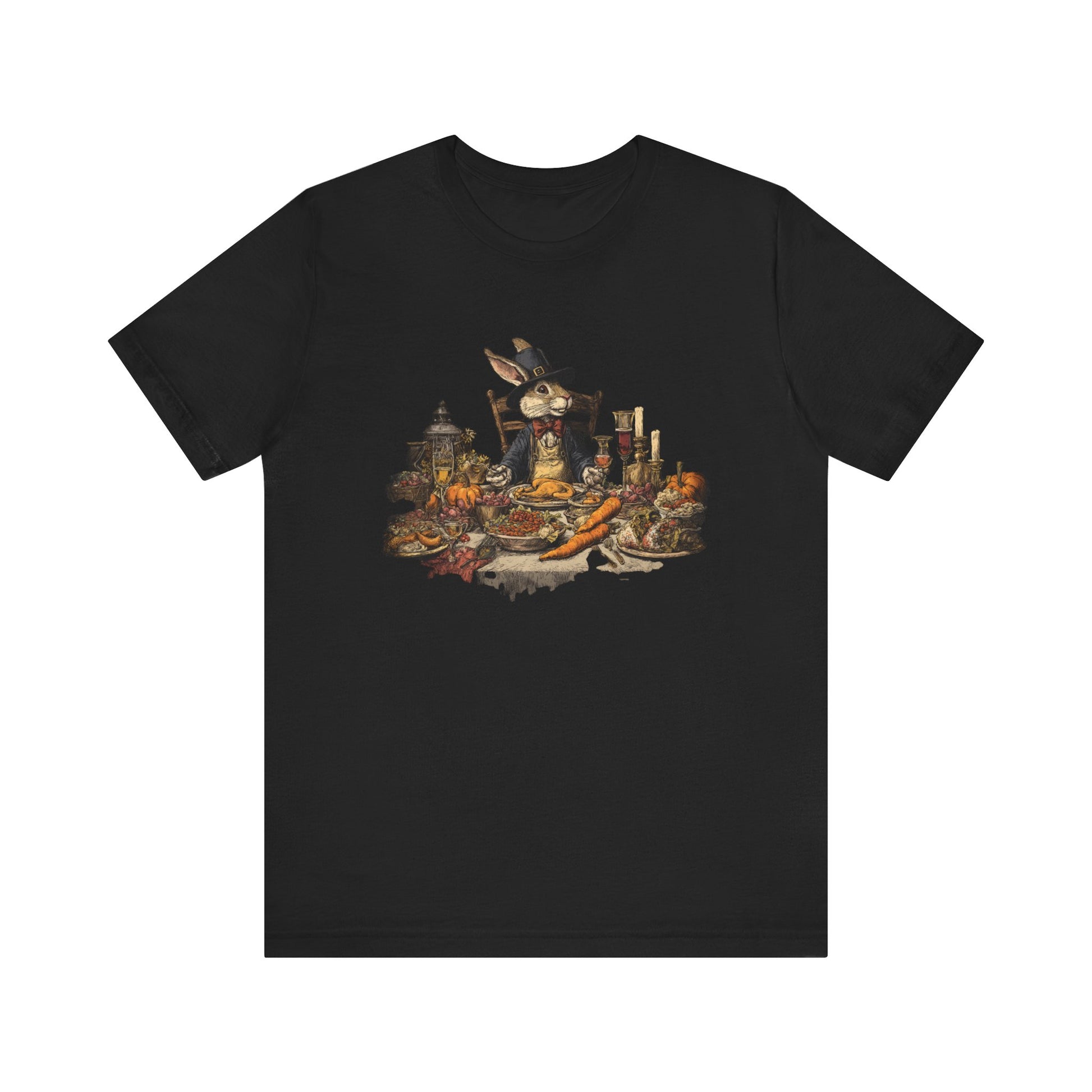 Thanksgiving rabbit feast t-shirt with whimsical autumn dinner artwork. Cozy holiday tee for harvest celebrations & fall gatherings.
