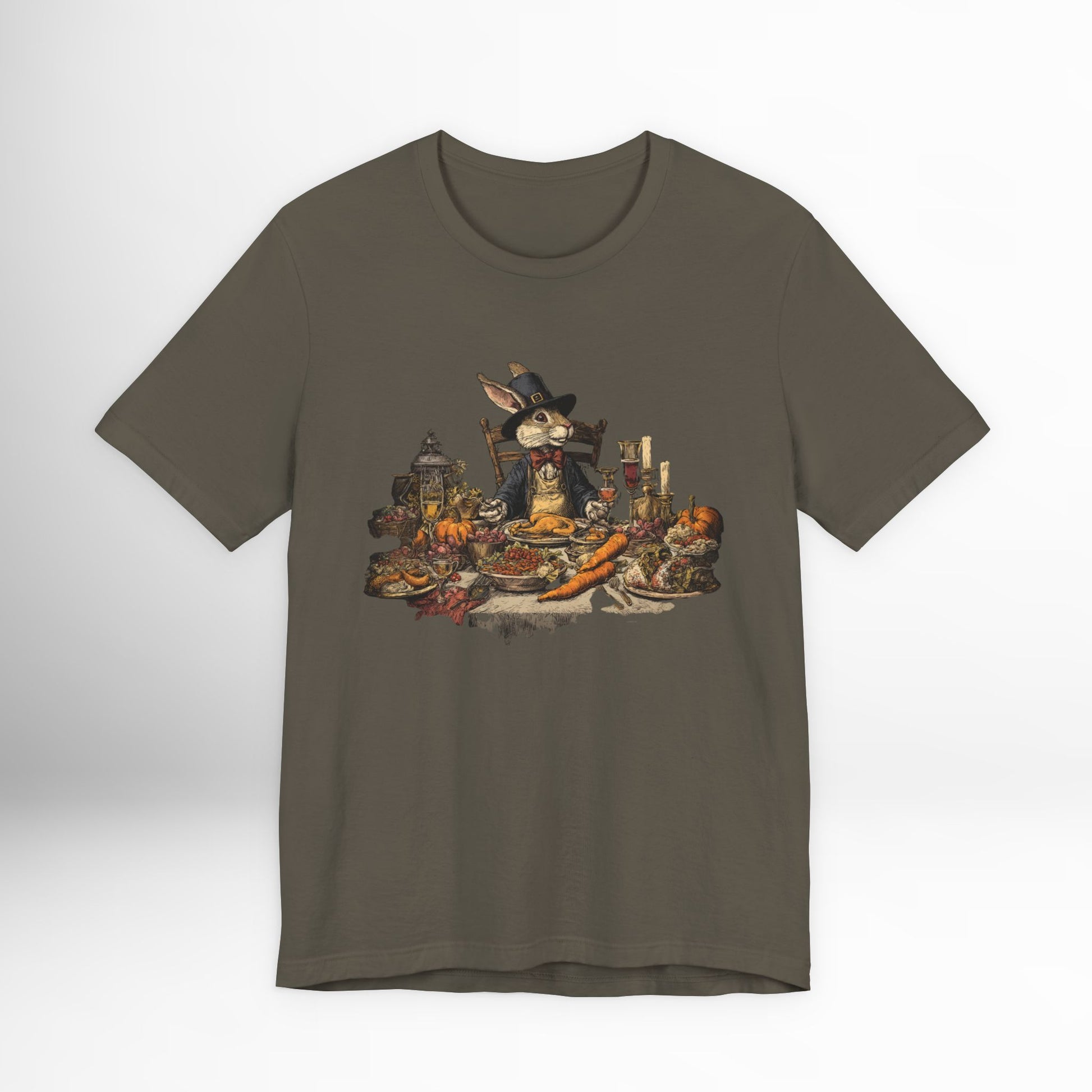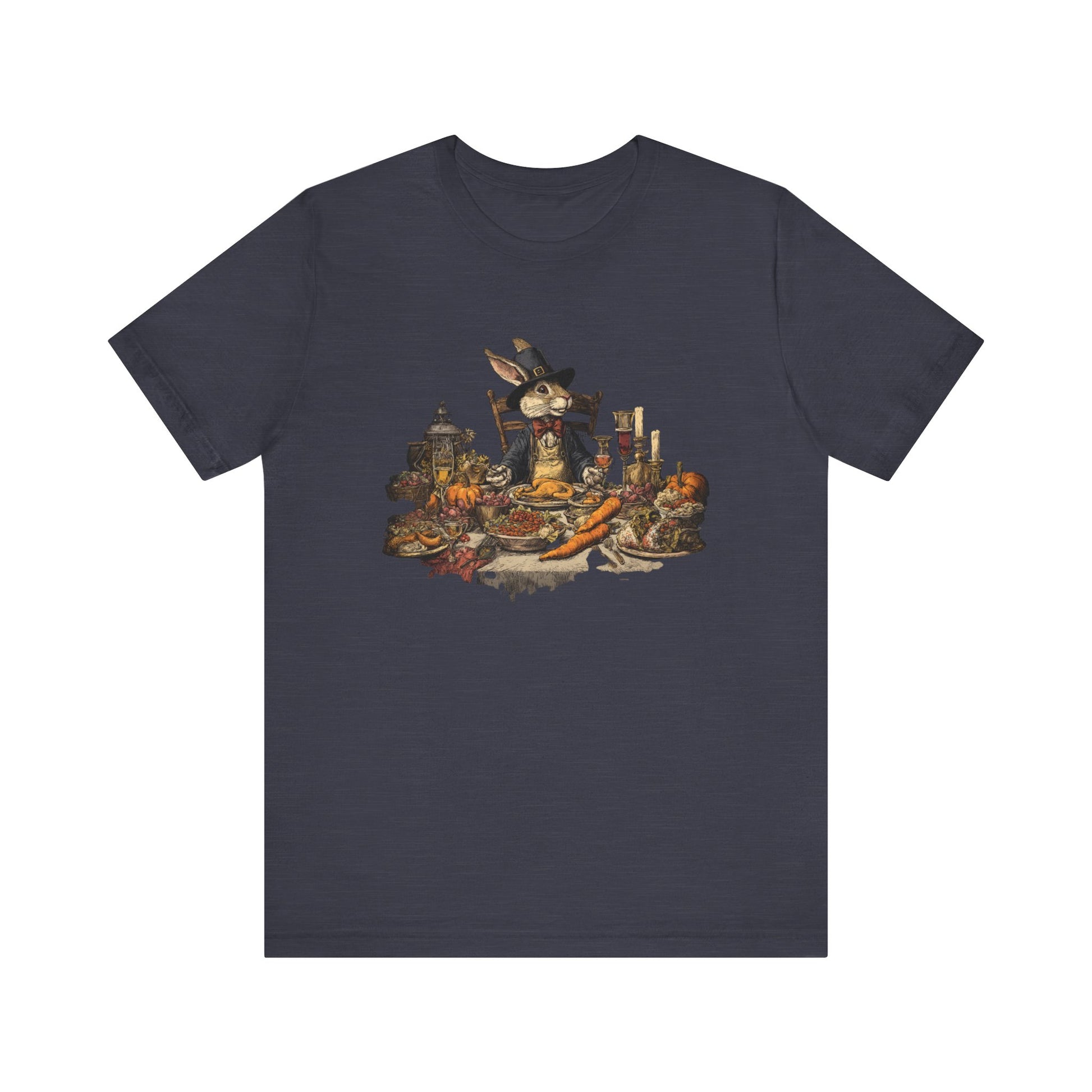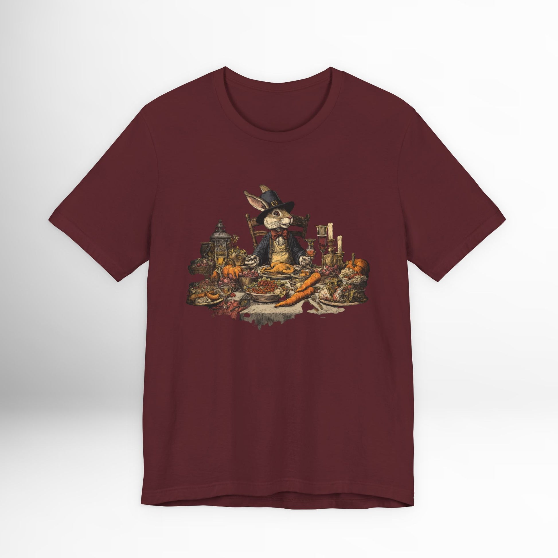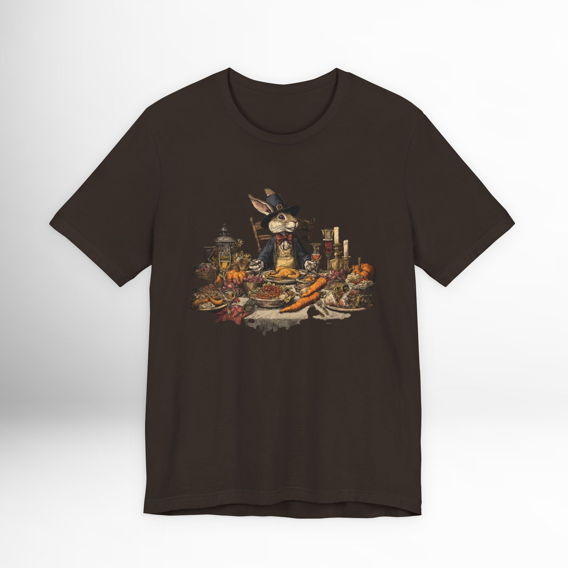 Thanksgiving rabbit feast t-shirt with whimsical autumn dinner artwork. Cozy holiday tee for harvest celebrations & fall gatherings.